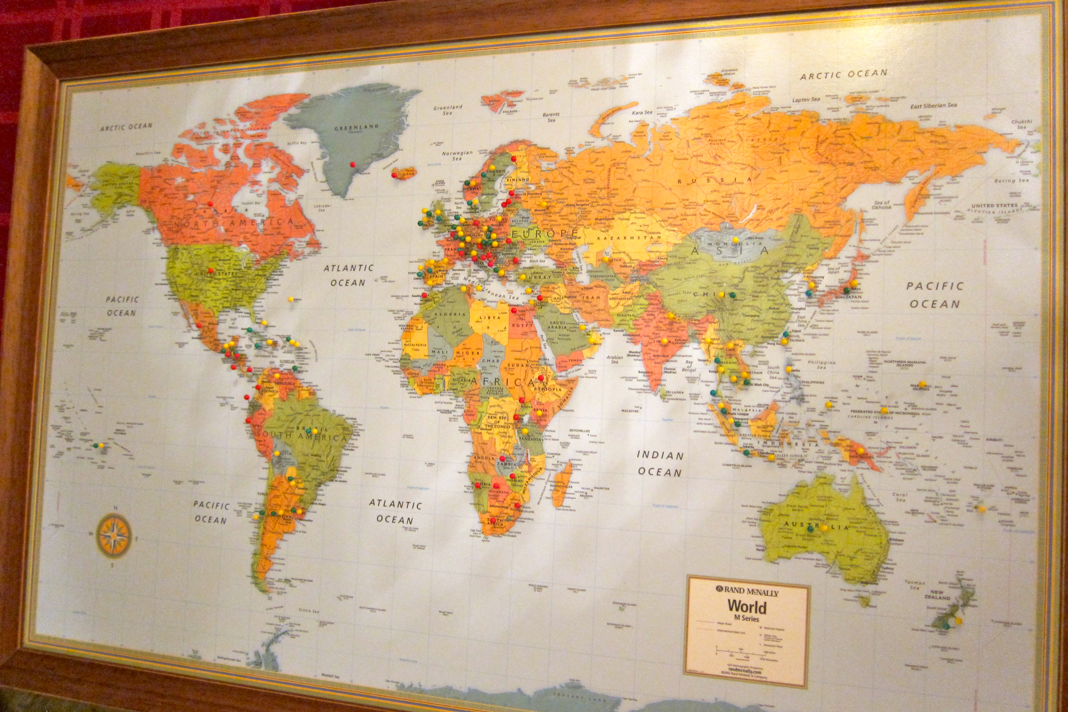 As a child Sue took summer road trips with her family—somewhat uncomfortably as multi-sibling road trips tend to be—visiting all 48 contiguous states before she was 15. Later, as a manager and executive in the insurance industry, she traveled the world doing business development and acquisitions, including several years living in Italy and Luxembourg. Now she speaks French and Spanish and has been to more than 140 countries! Yes, 140! Her part of the map shows far more places that she has already been to than remain to be visited.