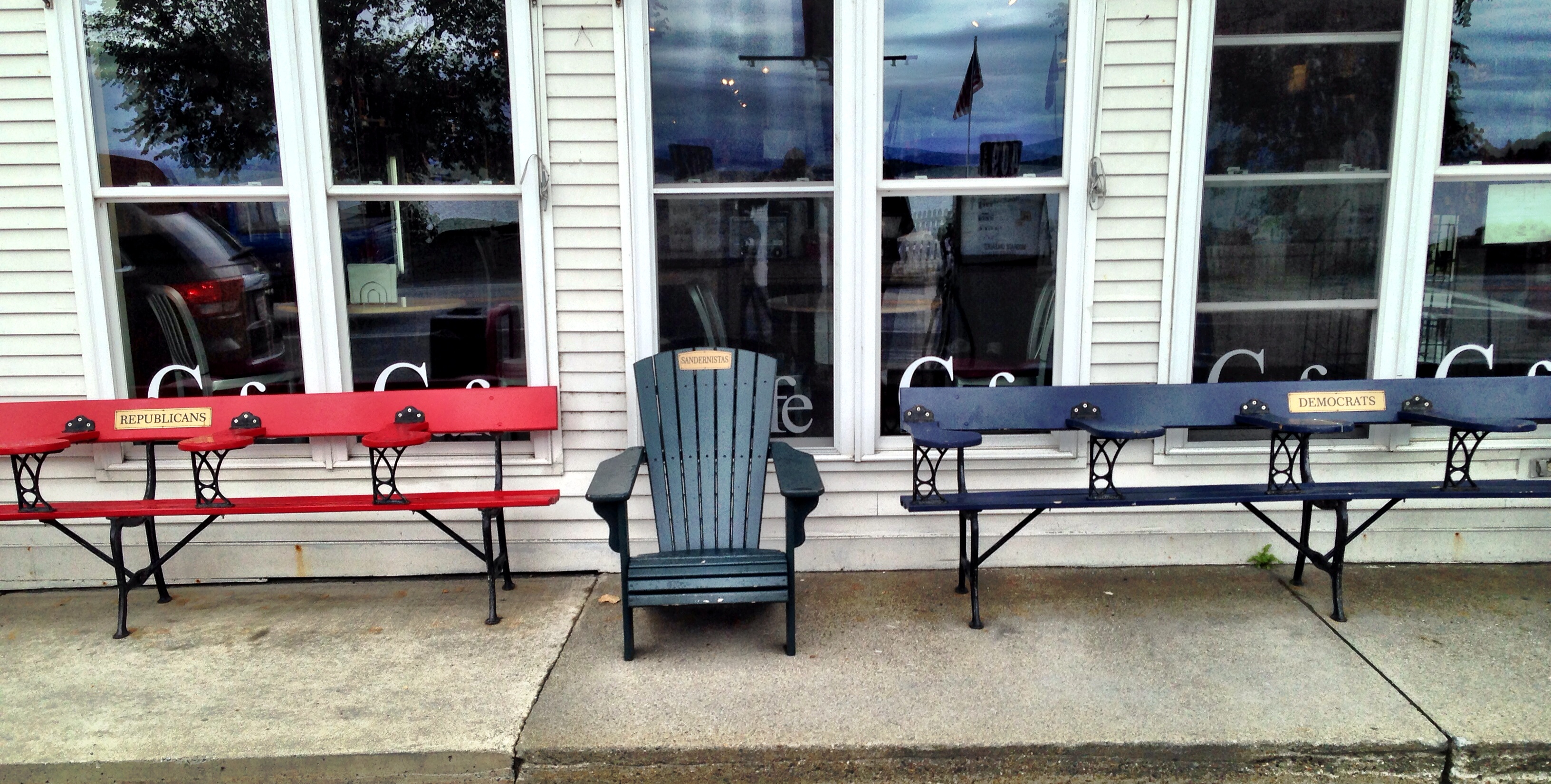 Maybe it’s successful because it caters to all, no political discrimination. The red bench is for Republicans, the blue for Democrats, and for those not from the area, the “Sandernistas” plaque alludes to Vermont Senator Bernie Sanders, an Independent you may see running for president in 2016.