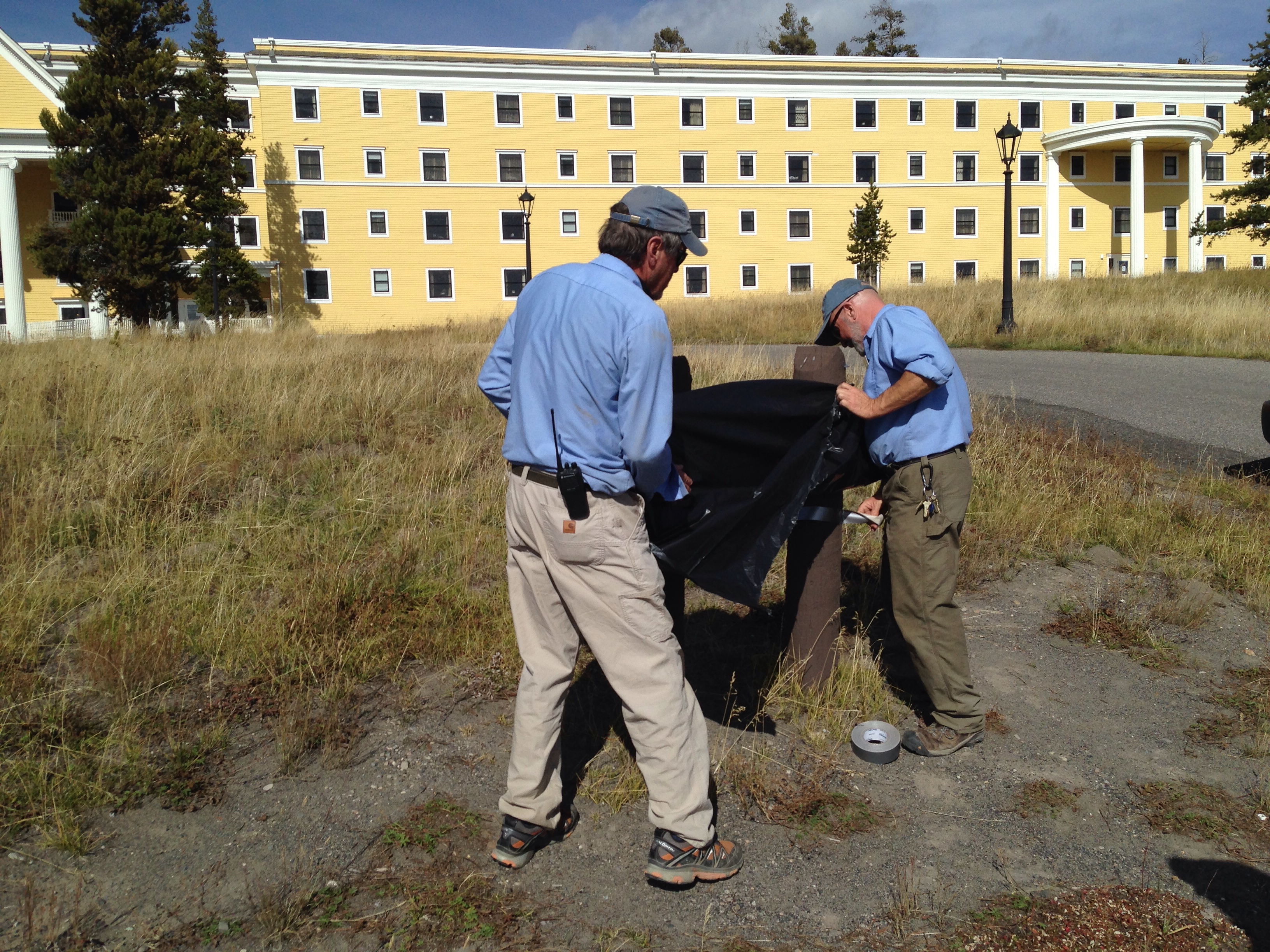 Just as at Teton NP, today was the last day for lodge operations at Yellowstone. We caught the housekeeping staff having a wine toast in front of the Lake Yellowstone Hotel. And two of the groundskeepers were covering the entrance sign just to be sure no one tried to check in. Dale, at the left, stays here year-round, alone, as caretaker. Anyone hearing the theme music from The Shining?