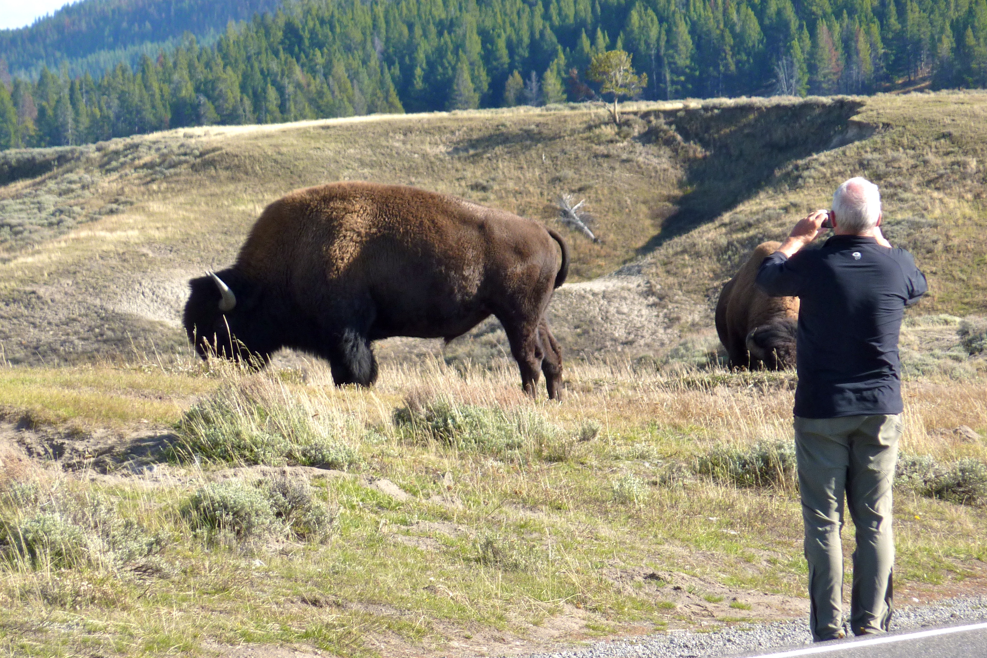 Park visitors are told to stay 100 yards from a grizzly or wolf and 25 yards from a bison. Michael wasn’t exactly following that rule here.