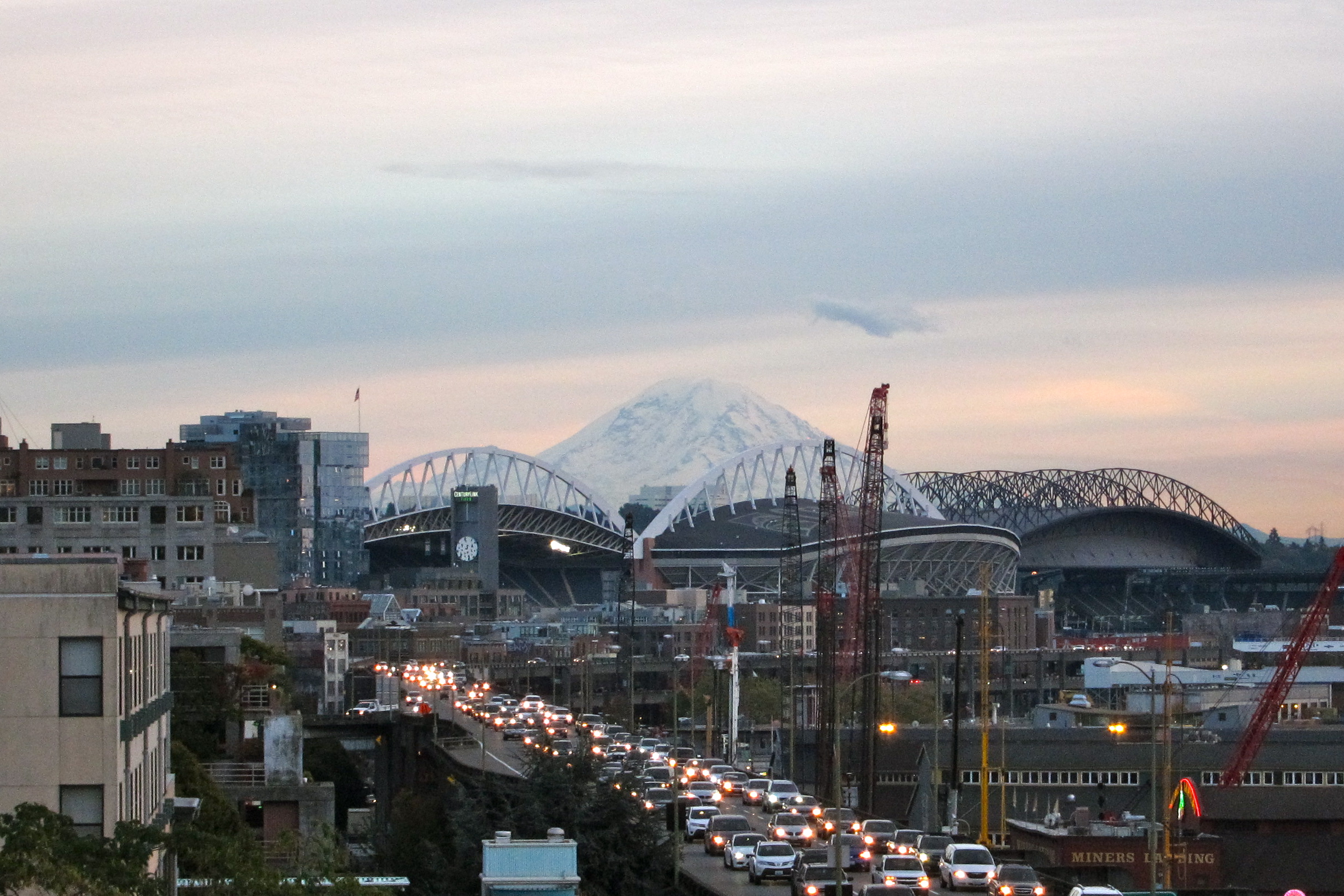 Pike’s offers a view of Mt. Rainier over the Seattle Seahawks stadium.