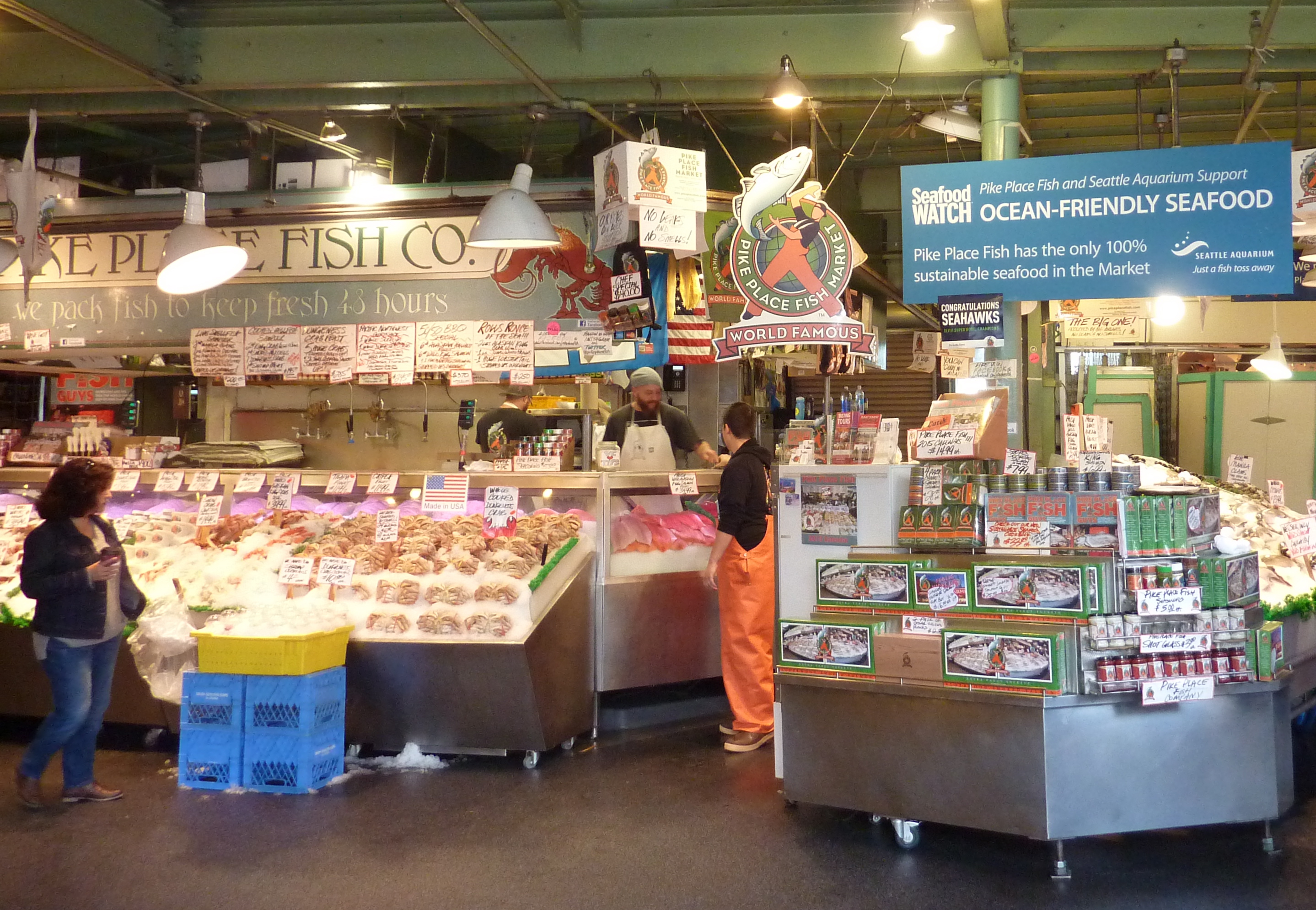 specifically the Pike Place Fish Market. Whenever a customer orders a fish, workers shout to each other and fling the fish through the air. Actually the guy in front keeps a spare fish on the side specifically for this; it gets mangled quite quickly. It’s not just a fun thing to watch, but a management methodology. Read about it in When Fish Fly: Lessons for Creating a Vital and Energized Workplace from the World Famous Pike Place Fish Market.