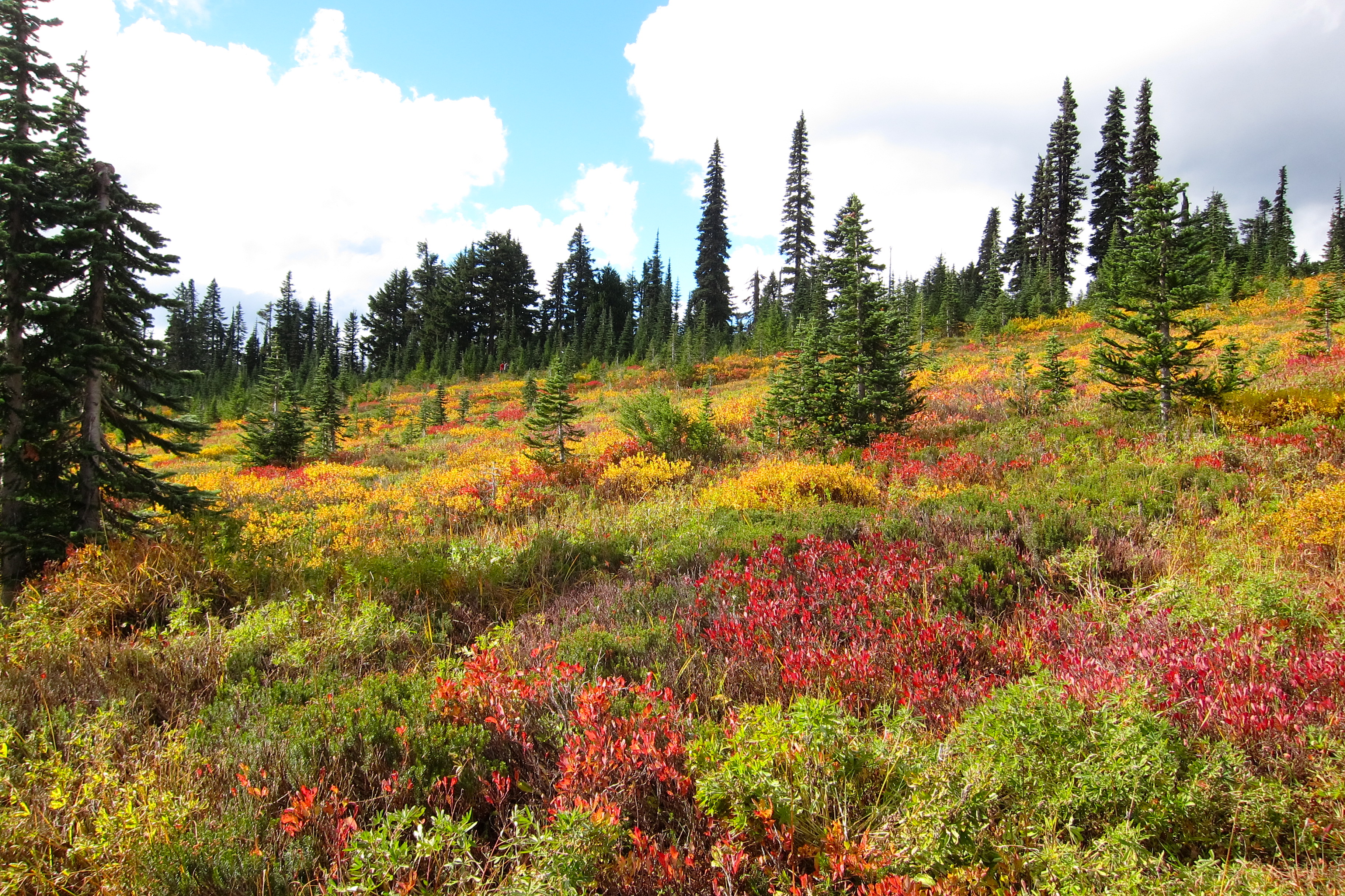 And we followed Alta Vista down for another perspective. Another hiker told us this would give us the best view of fall foliage, so we expected yellow aspen, red oak, and more. Instead the hills were alive with the colors of shrubs. Green lupine plants are everywhere; their lavender blossoms peaked in July and August. Other plants have turned red, orange, and yellow.
