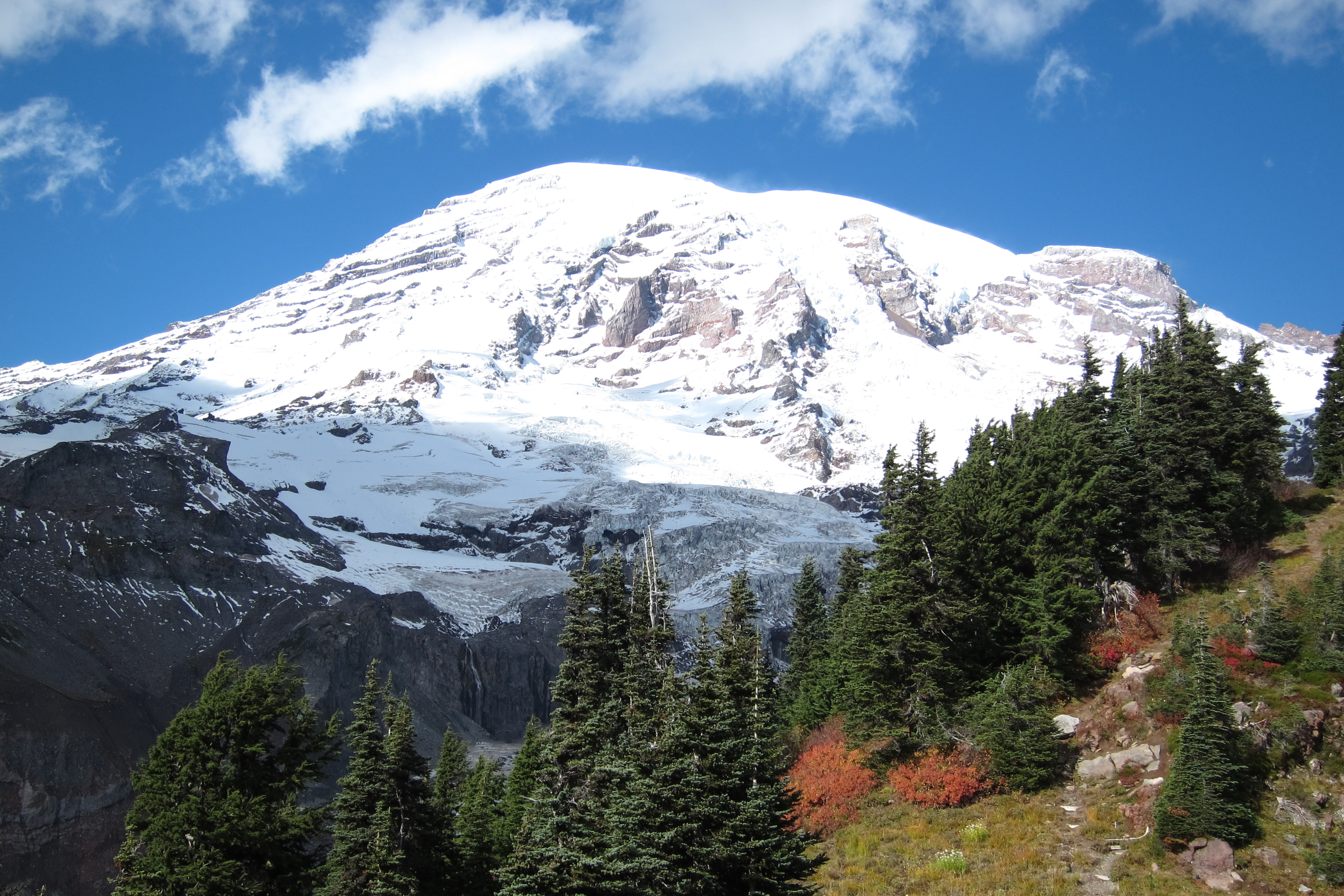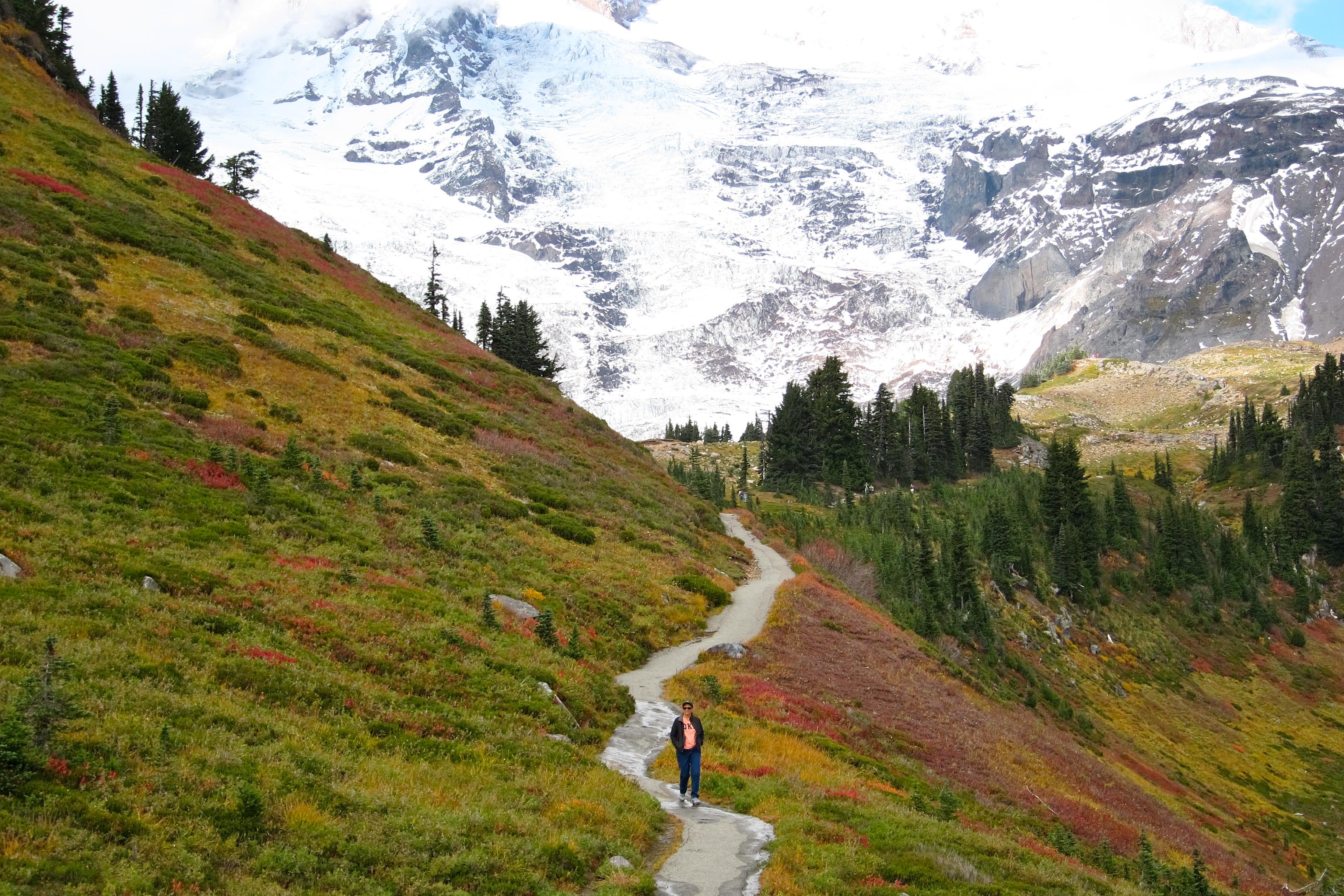 Descending (by car), we once more appreciated the work by the National Park Service in making these sights accessible. The 83-mile Road to Paradise offers views of the mountains, waterfalls, canyons, and beautiful foliage.