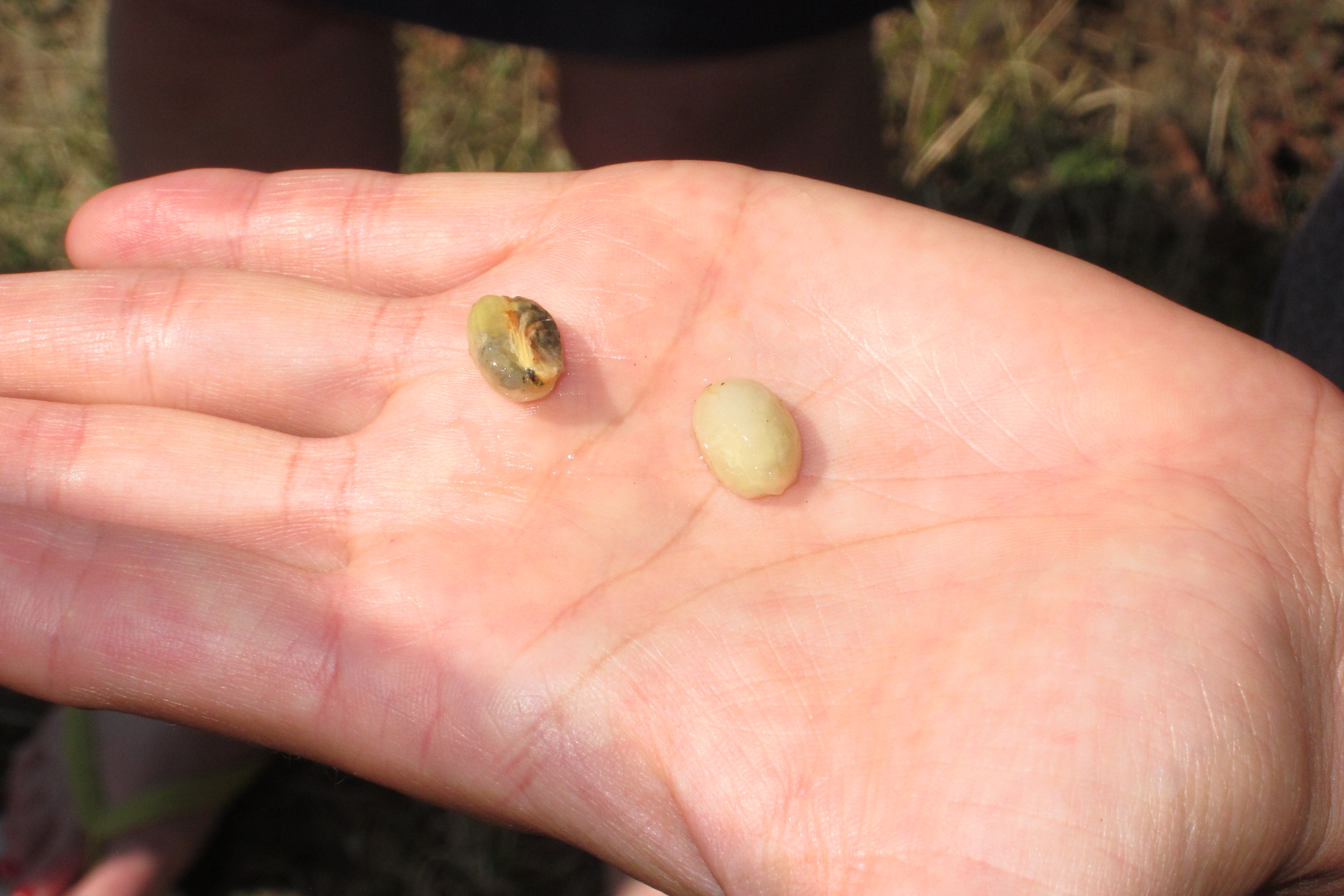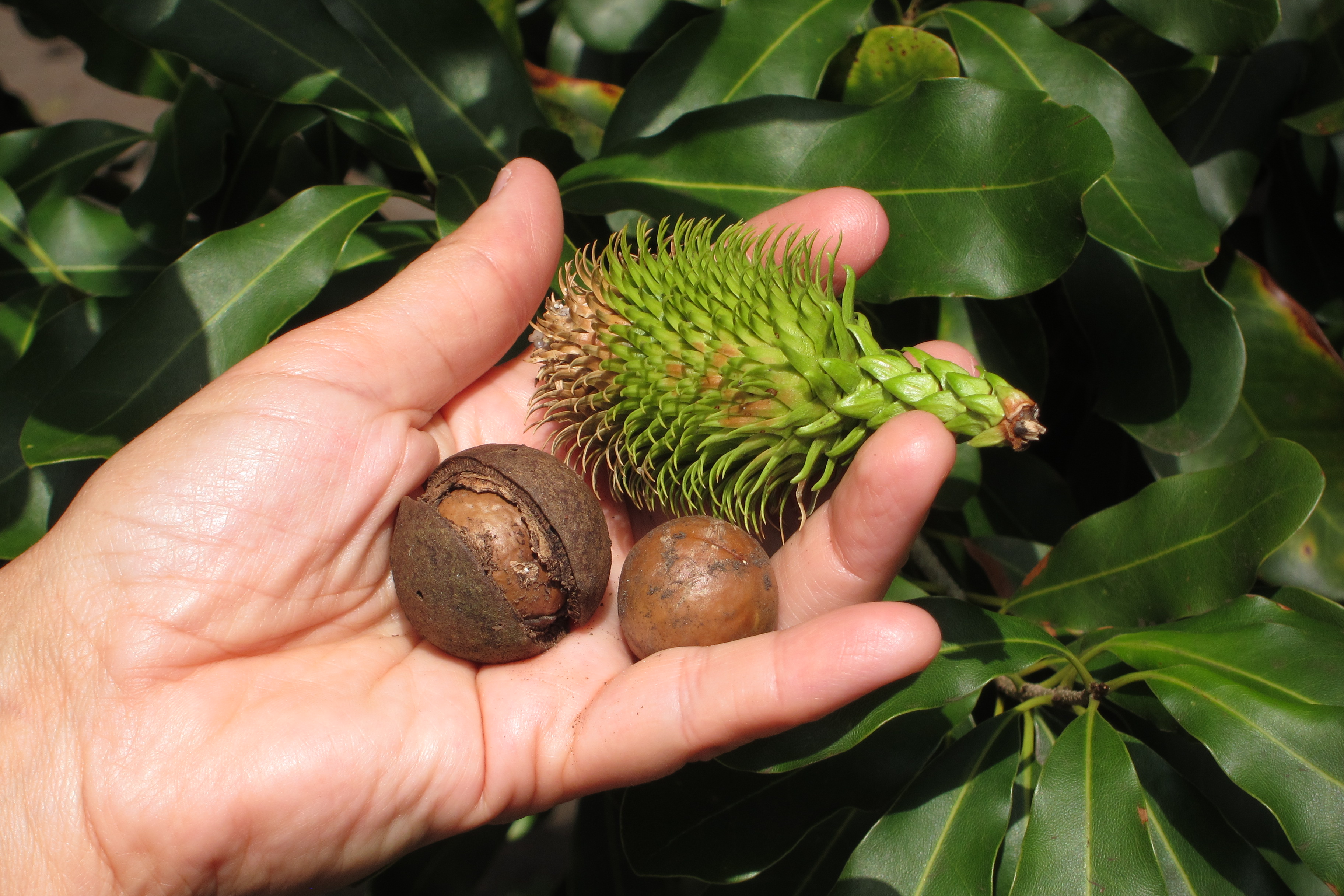 The people at Greenwell Coffee told us macadamia nuts are oversupplied right now, bringing the selling price too low for profitable farming. Even so, it is the most expensive nut in the world, mostly because of the difficulty of cracking the super hard shell without damaging the nut.