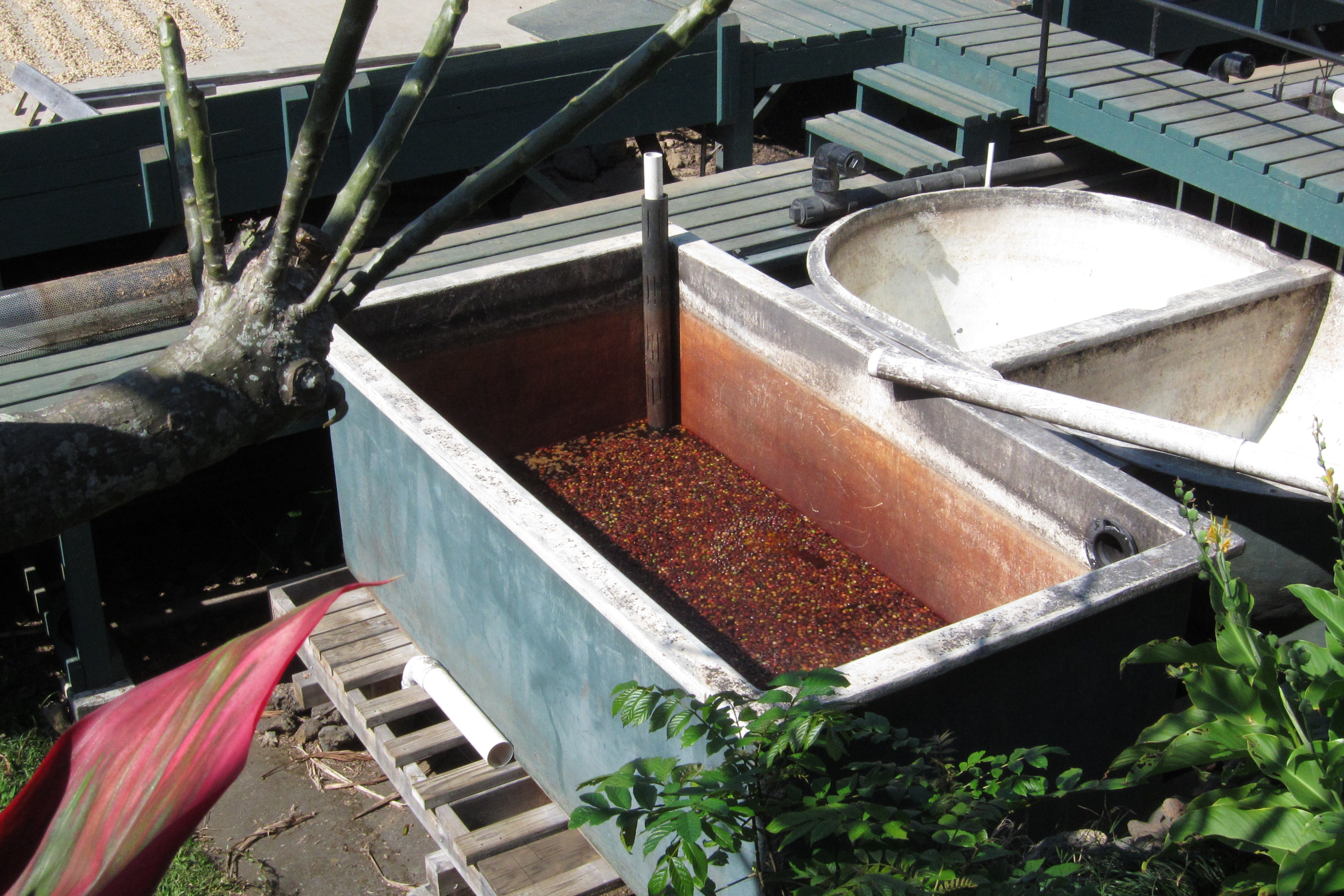 The first step of processing is sorting in a float tank. The cherries with beetles are lighter than “good” beans so they float to the top.