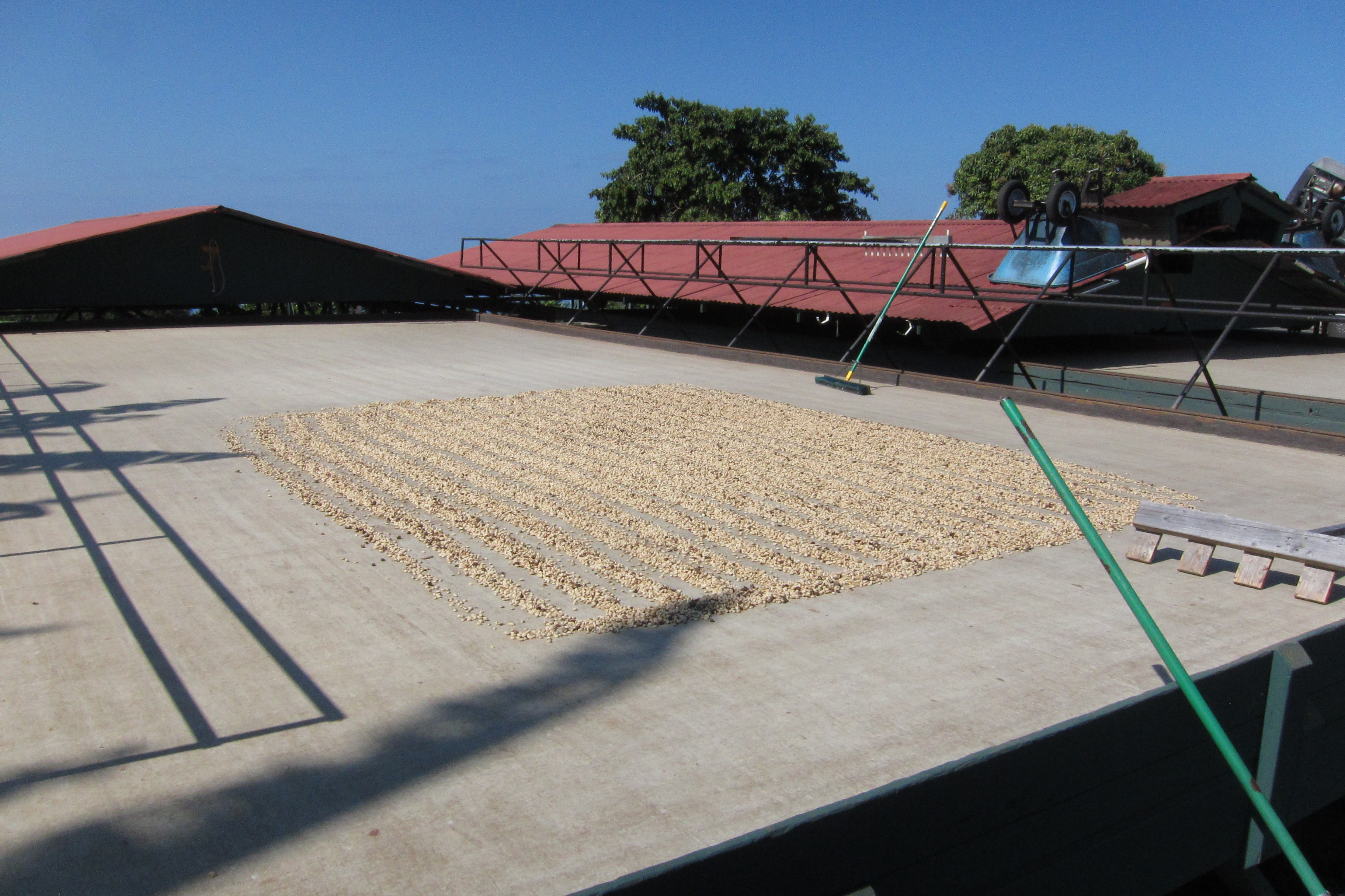 A dry mill takes the heavy shell off the bean and then the silky inner skin. Fermenting for 16 hours removes sugar. In the drying process, beans are raked for seven days every 15 minutes on a deck in the sun with a retractable roof for night time and rainy days.
