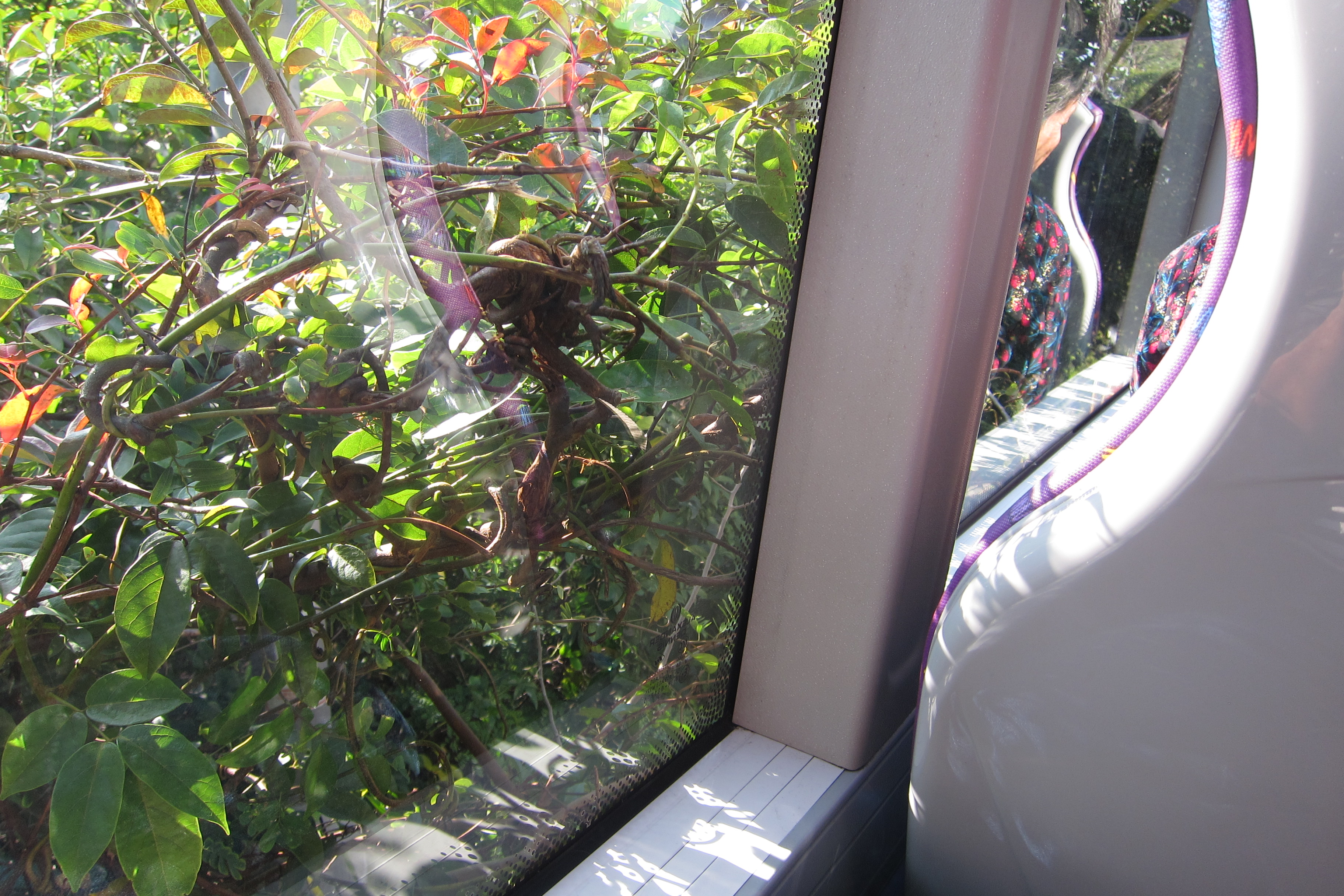 Looking out the upper deck window directly into foliage. No need for workers to trim the trees; the buses do it.