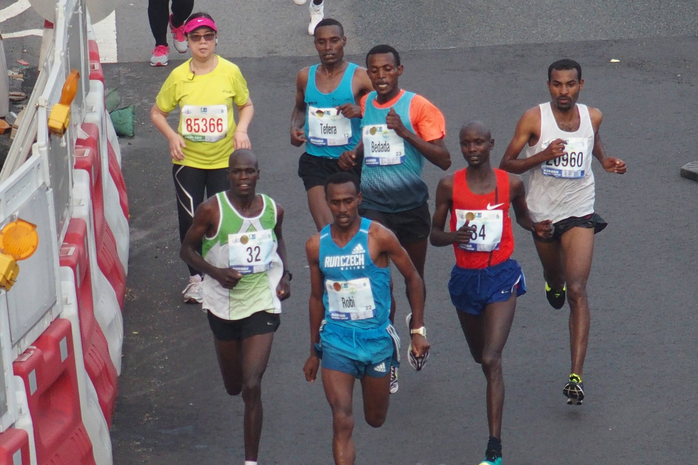 The man on the far right was the marathon winner in 2015. (The guy in yellow on the left was a half-marathon runner who started several hours before the marathon group.)
