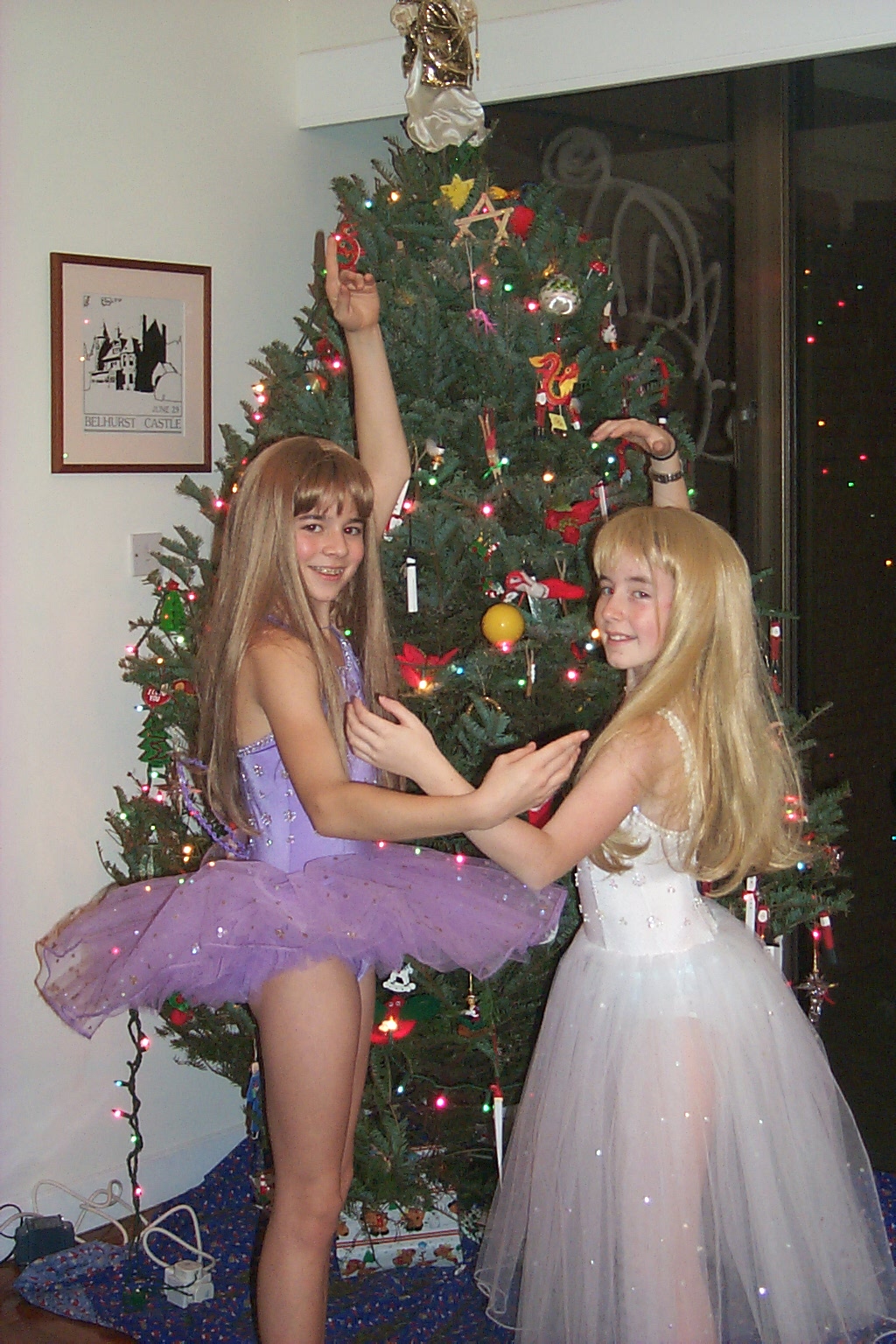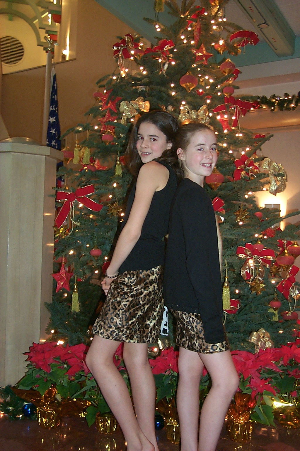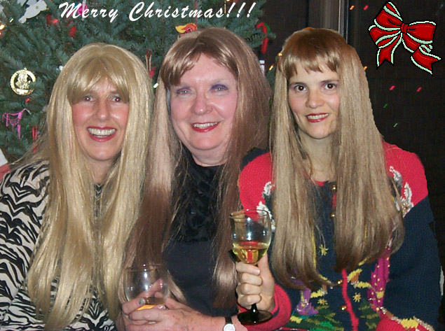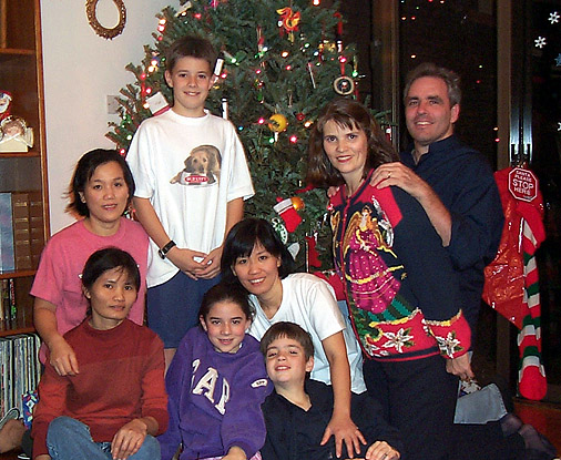 Gilda in white, Gina in pink, Gemma in red. Nancy in a Stanley Christmas sweater. Chris was usually able to reach up and touch the top of our Hong Kong Christmas trees.