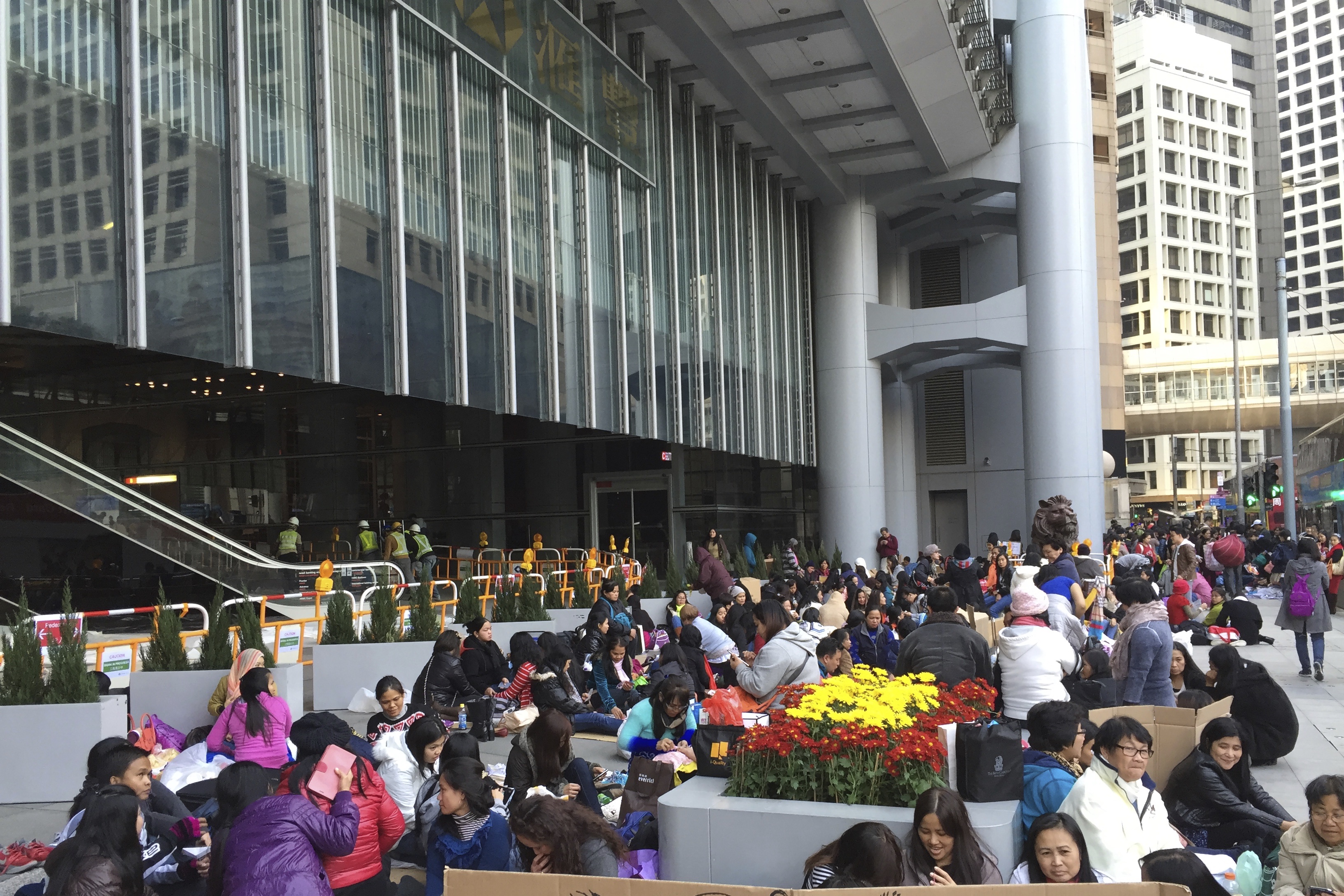 Hundreds of amahs were gathered around and under HSBC bank on Sunday, sharing photos, having a meal together, enjoying their limited time off.