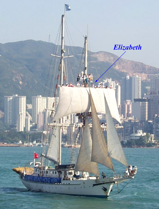 Liz had her own seafaring experience. As part of a school interim activity, she had several days of an Outward Bound experience on a two-masted schooner, the Ji Fung. They bathed by jumping in the ocean. Liz loved the whole thing. On the way back, the kids climbed the mast and waved as they sailed into Hong Kong Harbor.