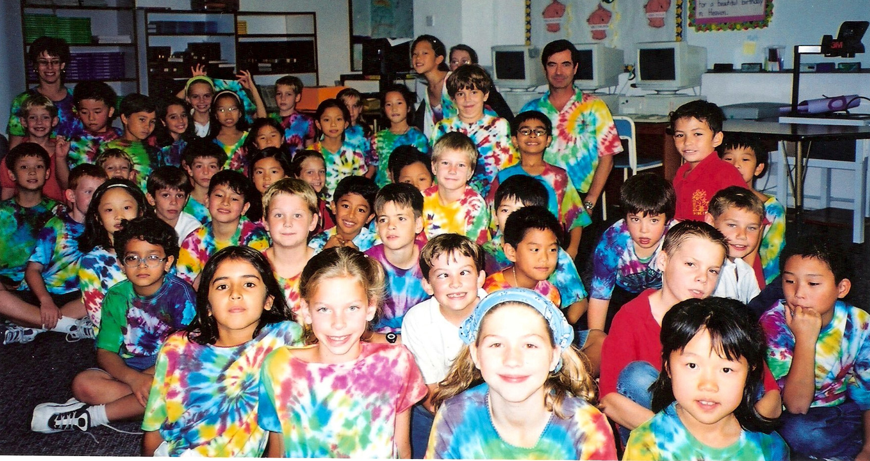 Pat may have formed his love for tie-dye at HKIS. Can you find him? (in the blue and purple in the middle)