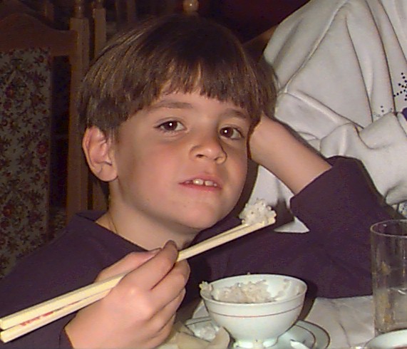 Before we moved to HK, the kids had a relocation orientation session including lessons with chopsticks. The key is to put peanut butter on the eating ends; then you can pick up anything. (Pat here with rice; he would have preferred peanut butter.)