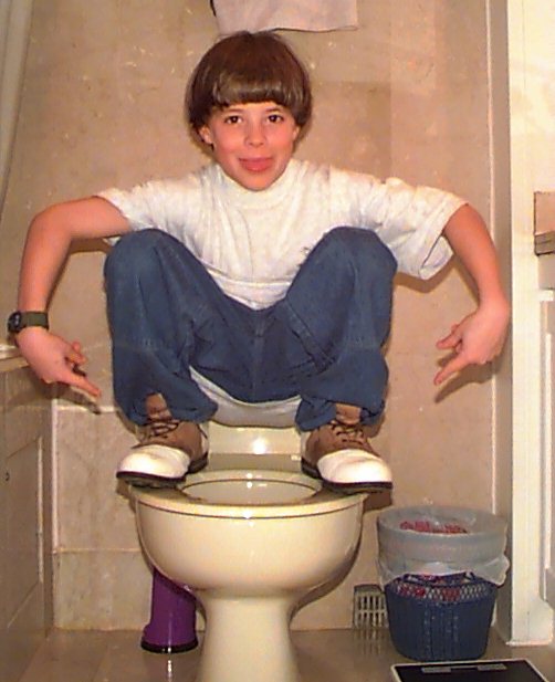 Chris played golf with Michael. Here he’s demonstrating how unusual marks get on the toilet seats. They look amazingly like marks from golf cleats. (Same thing at the hockey rink with skate marks.)