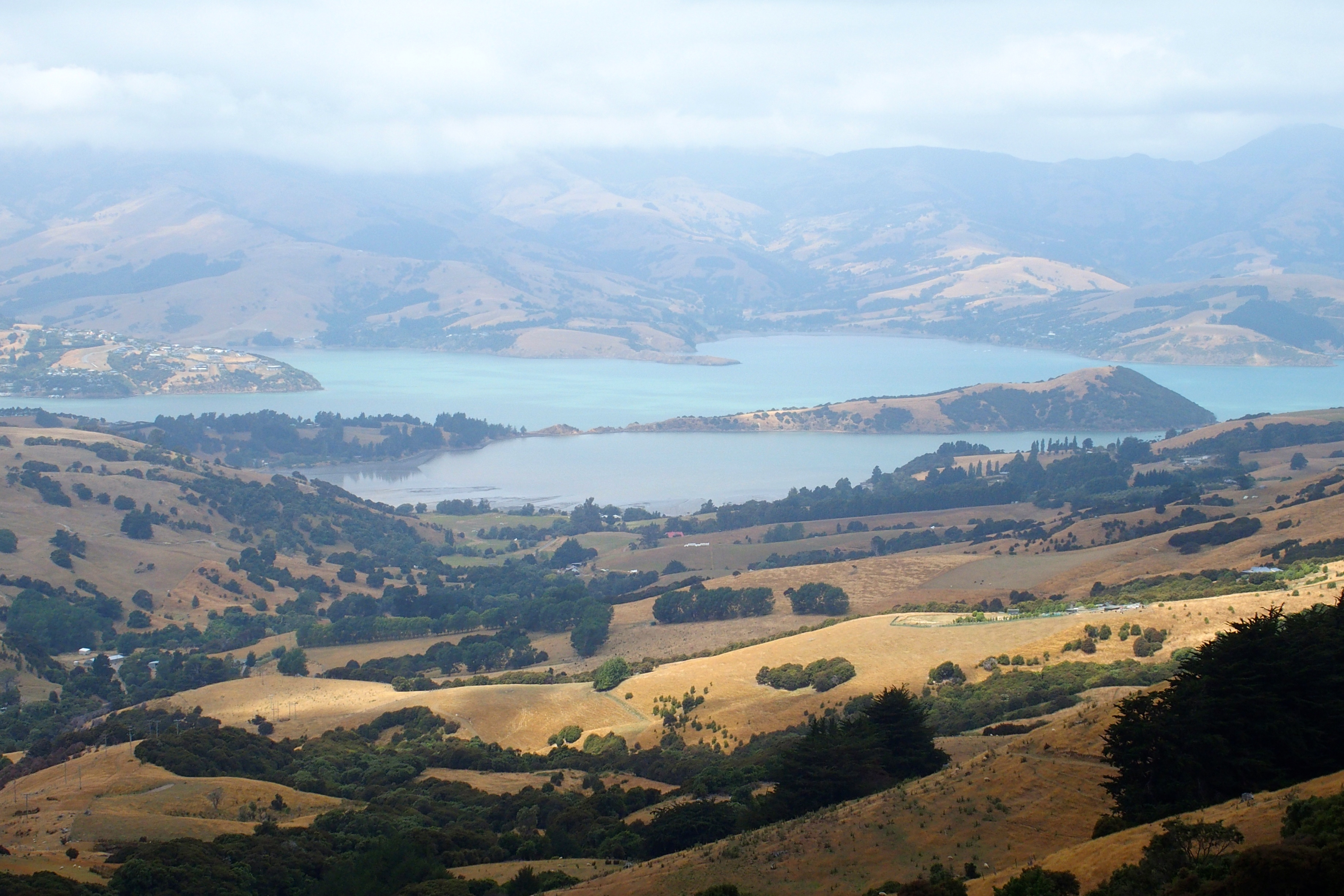 Our first day was a sidetrip south to Akaroa, a resort area that is unique in having French and British influence, both powers having established a settlement in the area in August 1839, actually within a couple days of each other. Now streets on the north side of town are Rues and those on the south are just streets. We found a French restaurant for lunch, Ma Maison, and had our first New Zealand food, wine, and views. All quite nice.