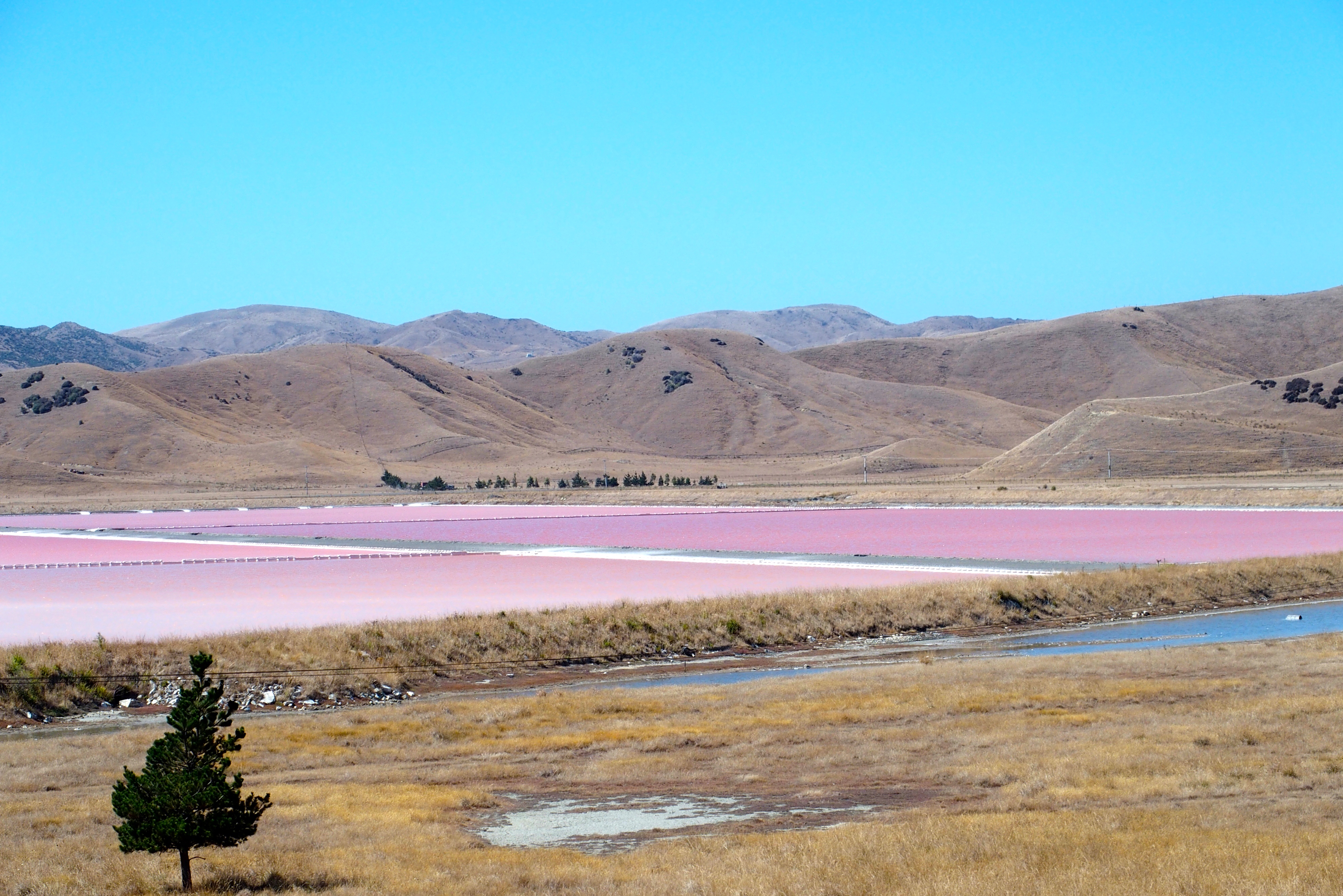We approached the wine region of Marlborough, but first reached the salt region of Marlborough. Salt from the Pacific Ocean is pumped into Lake Grassmere where it dries in the breeze and is processed. Later in our travels we noticed premium potato chips made with “pure Marlborough salt.”