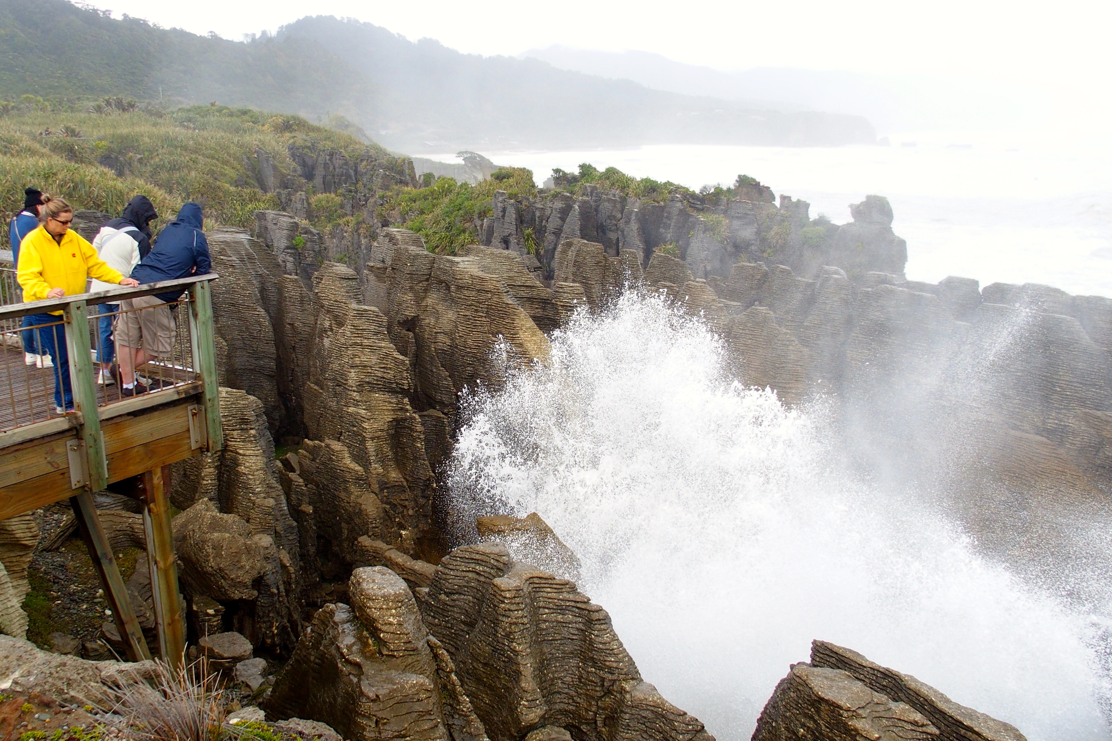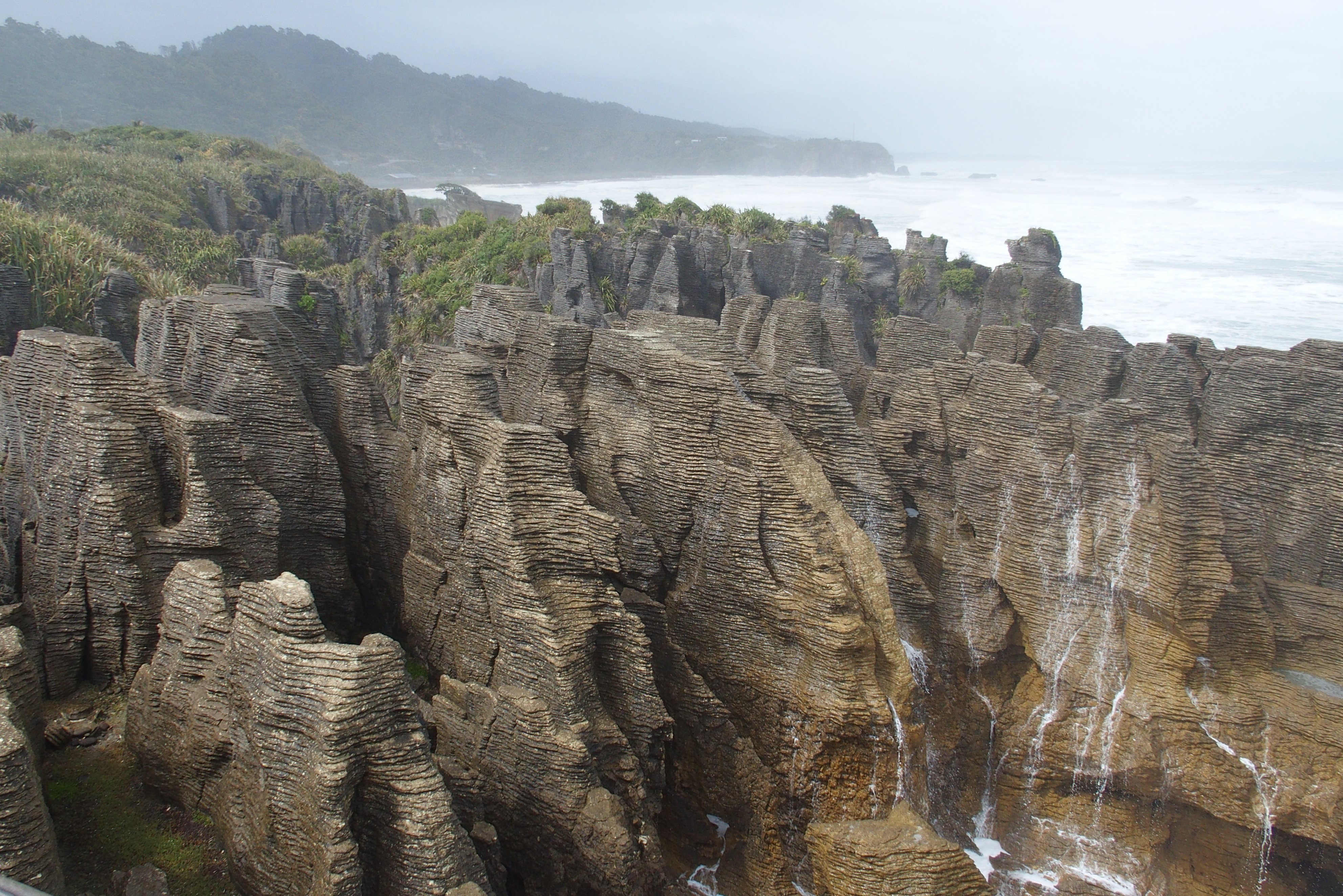 We stopped for pancakes in Paparoa National Park. More accurately, we visited the multi-layered pancake rocks of Punakaiki. These rocks are over 30 million years old and made of layers of limestone and mud. Waves, rain, and wind have etched away the softer material to leave these layers.