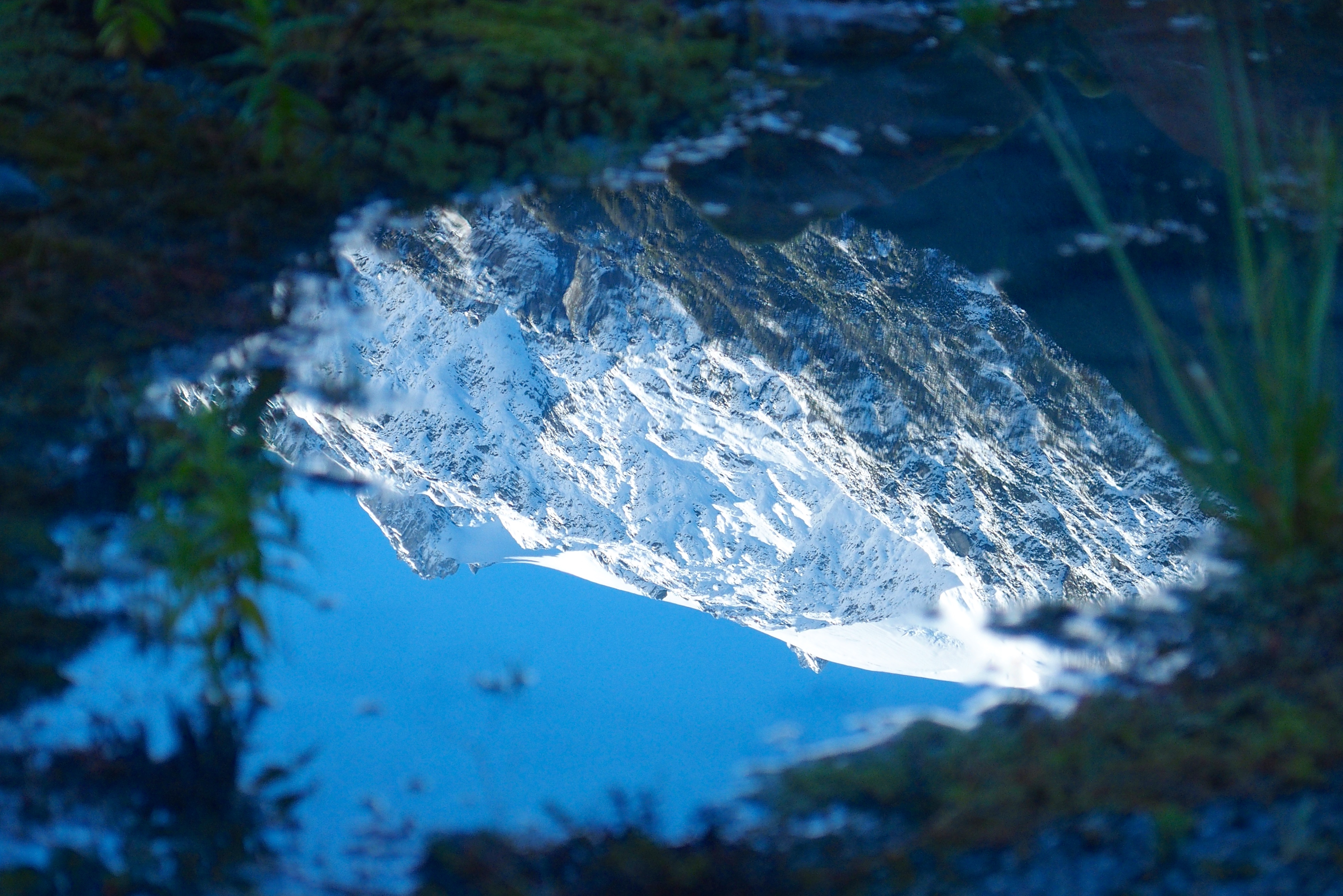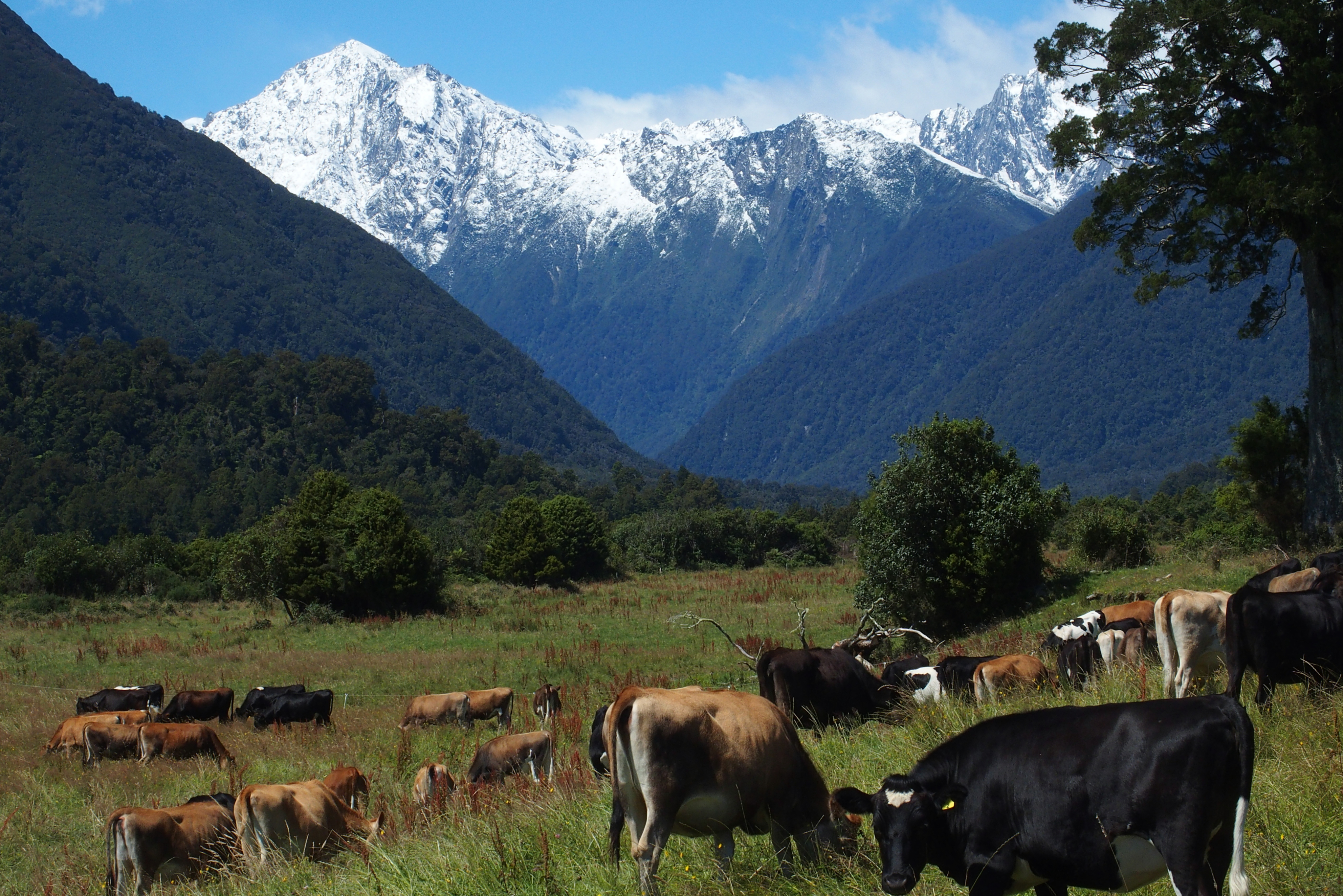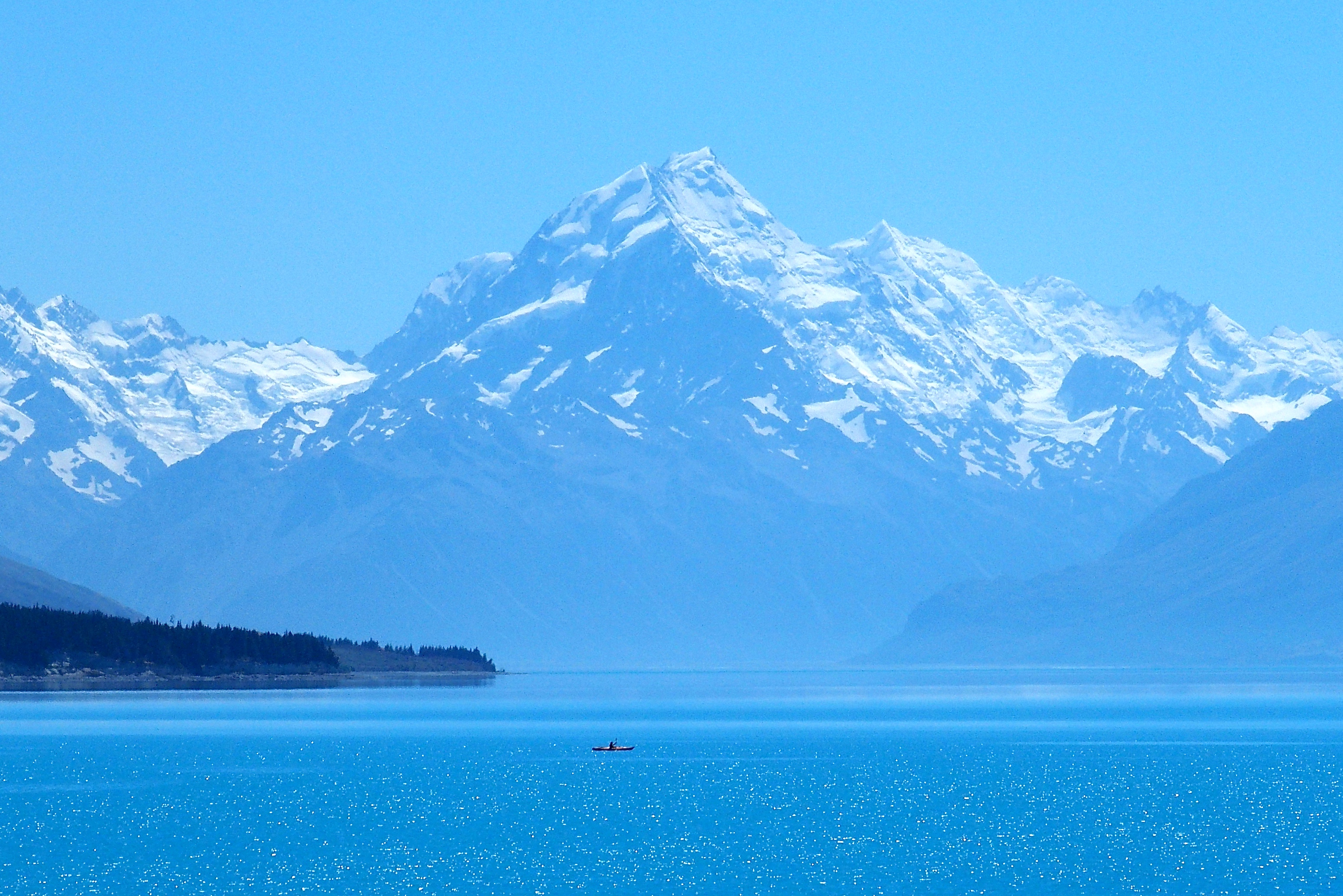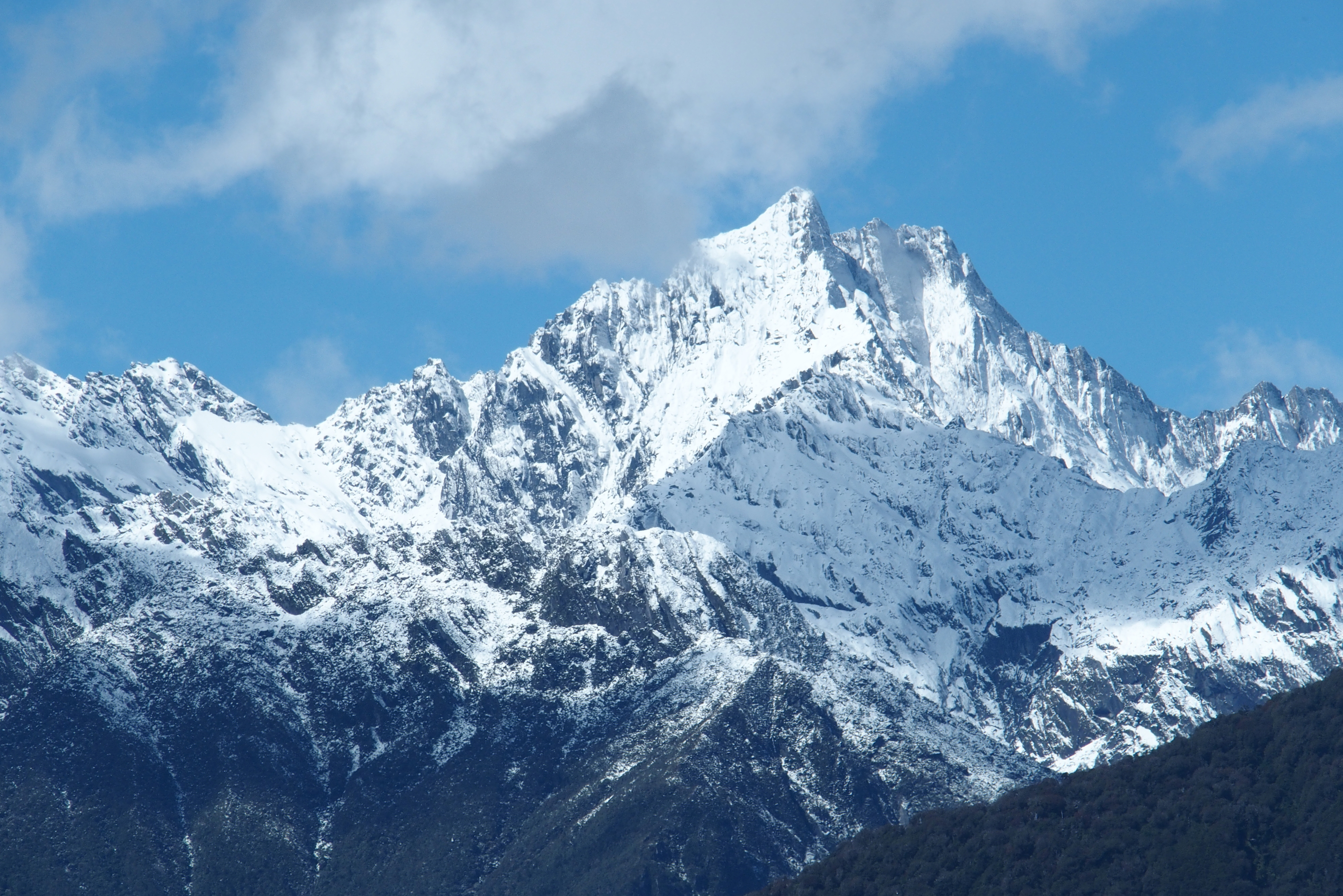 Mount Cook is over 12,000 feet tall, behind Fox Glacier. It appears somewhat taller because its base is just above sea level. As you look up at its peak, you see about 11,000 feet of rise. (Compare this to a fourteener near Denver. If you are in Denver, which is a mile (5,280 feet) high, and you look up to a 14,000-foot peak, it is less than 9,000 feet above you. Sir Edmond Hilary used Mount Cook to practice before he went on to conquer Everest.