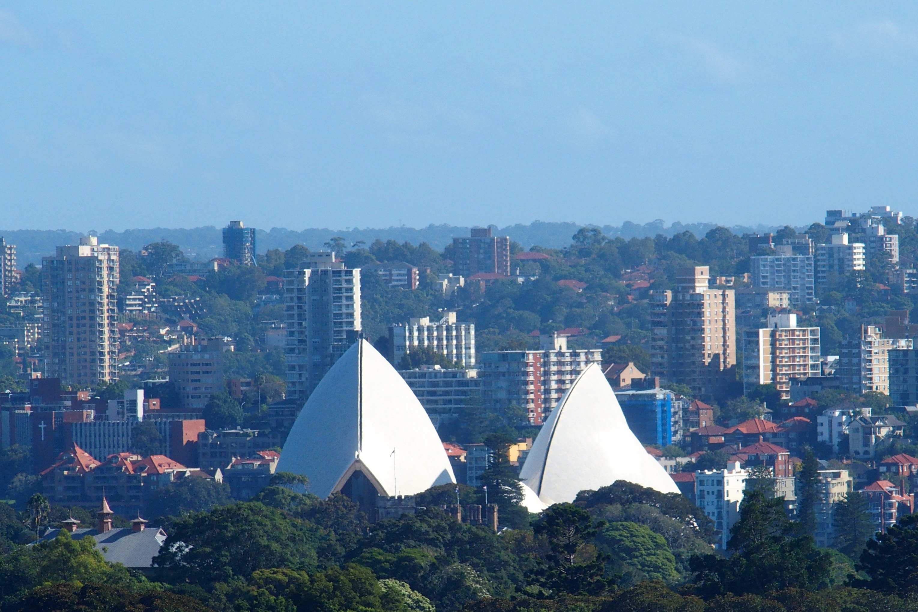 This view looks west from the Botanic Gardens toward the Opera House with a small glimpse of the Sydney Harbour Bridge in the background.