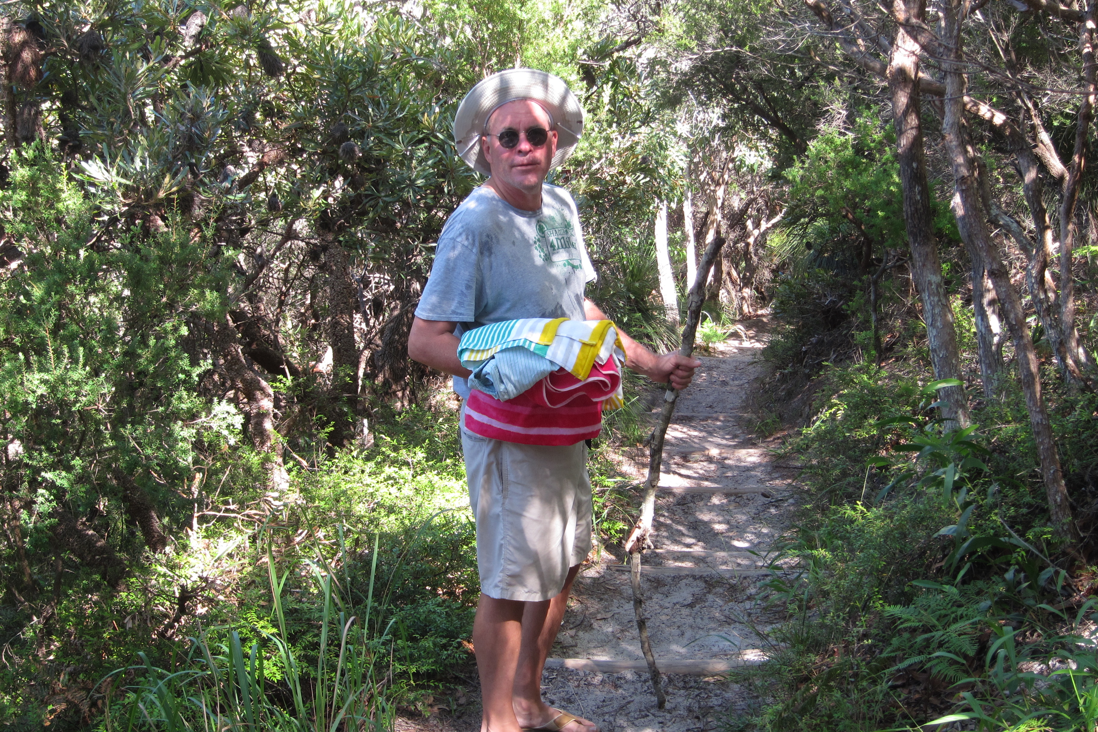 While walking along one trail from the beach we met a man with a stick who was inspecting the sand. He saw a trail he thought was from a goanna, a monitor lizard that can grow up to eight feet long! We didn’t notice anything like that on our way to the beach. He explained that the stick was for snakes—on the ground, along the trail, in the trees, probably flying through the air. Australians seem proud to say that of the 10 most poisonous snakes on the planet, they have eight. We didn’t see any snakes, but Michael found his own snake stick just in case.