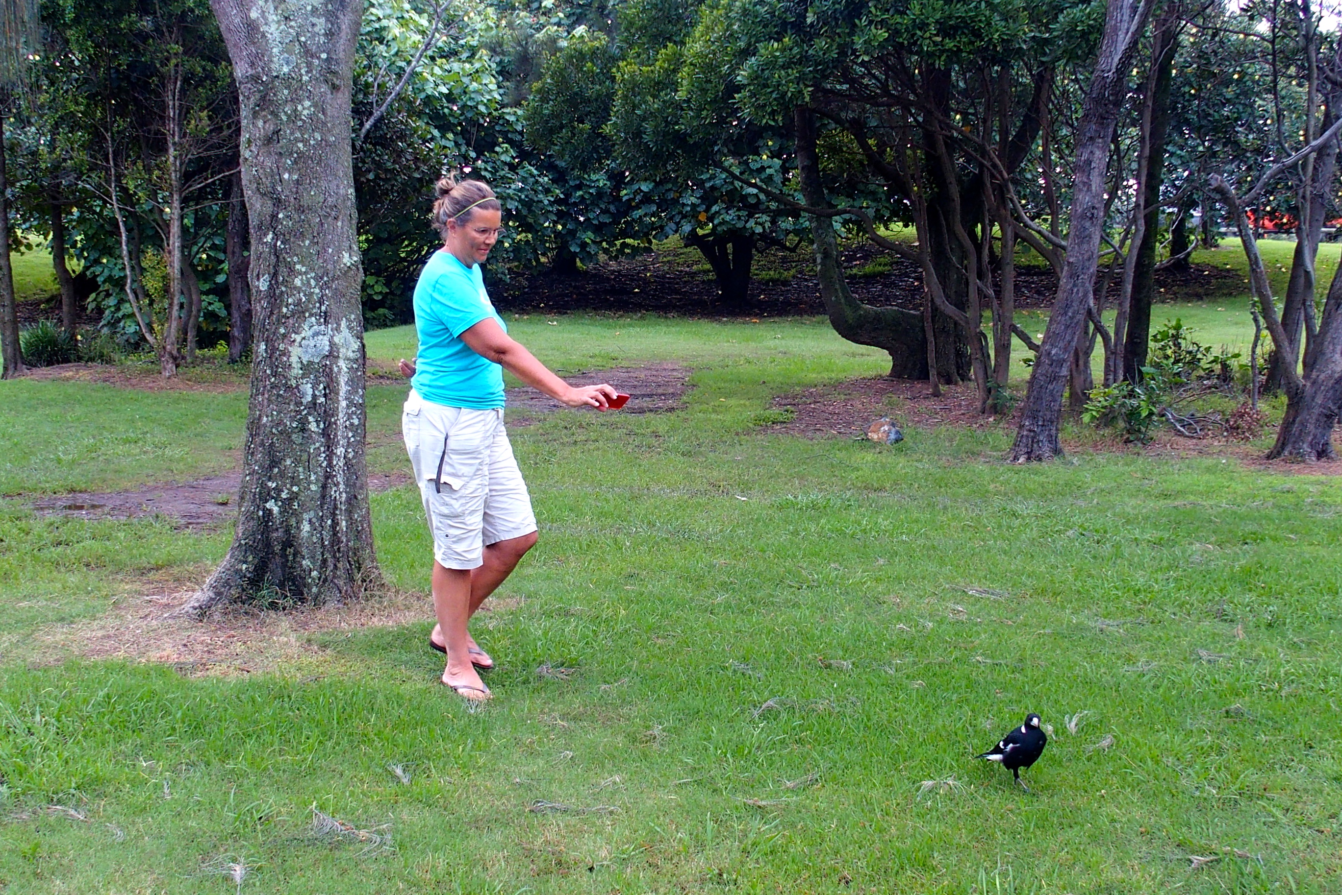 Our first Australian animal sighting was a bird, an ibis. Since this one was new to us after seeing scarlet ibises in the US, we chased the birds through Sydney’s Royal Botanic Park to get pictures. Meanwhile, when we asked the locals what they were, one lady said, “Oh, they’re just pists” (rhymes with fists). It took a minute to realize she was saying they were “pests.” We should have remembered that earlier a waitress had said, “Have this one; it’s bitter.” Of course she was saying it was “better.” The Australian accent is such a treat.