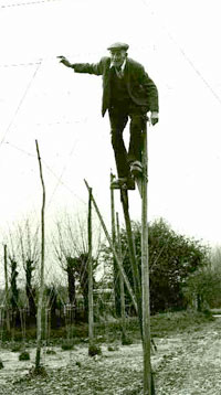 As children we all looked forward to going down there, it was a lot of fun. Sure we also picked plenty of hops from the bines, but before lunch and also before dinner (or tea time) it was our job to go and find enough ‘faggots’ (twigs and small branches) to get the fire going in order to cook and boil a large kettle (large old saucepan with lid and hanging type handle.) Our grandfather used to drive us down there in his Standard Vanguard, (he would trade it in for a new one every two years, always the same type of car,) then come to bring us back when the season was over. The two women in that photo with my cousin Ronnie and I, were his youngest sisters, both actually great aunts to me, the one on the left is still alive and still very much in possession of all her faculties at 95 years old. The other was Ron’s mother she passed away in the late sixties of ‘yellow fever’, I never did find out what that was, Ronnie now lives in the SW of France. By the way to my knowledge the fellas on stilts never picked the hops from the top, their main job was to firstly attach the cords the top of the frame and get them down at the end of the season, they also used to cover a lot of the bines with netting before the advent of bad weather.