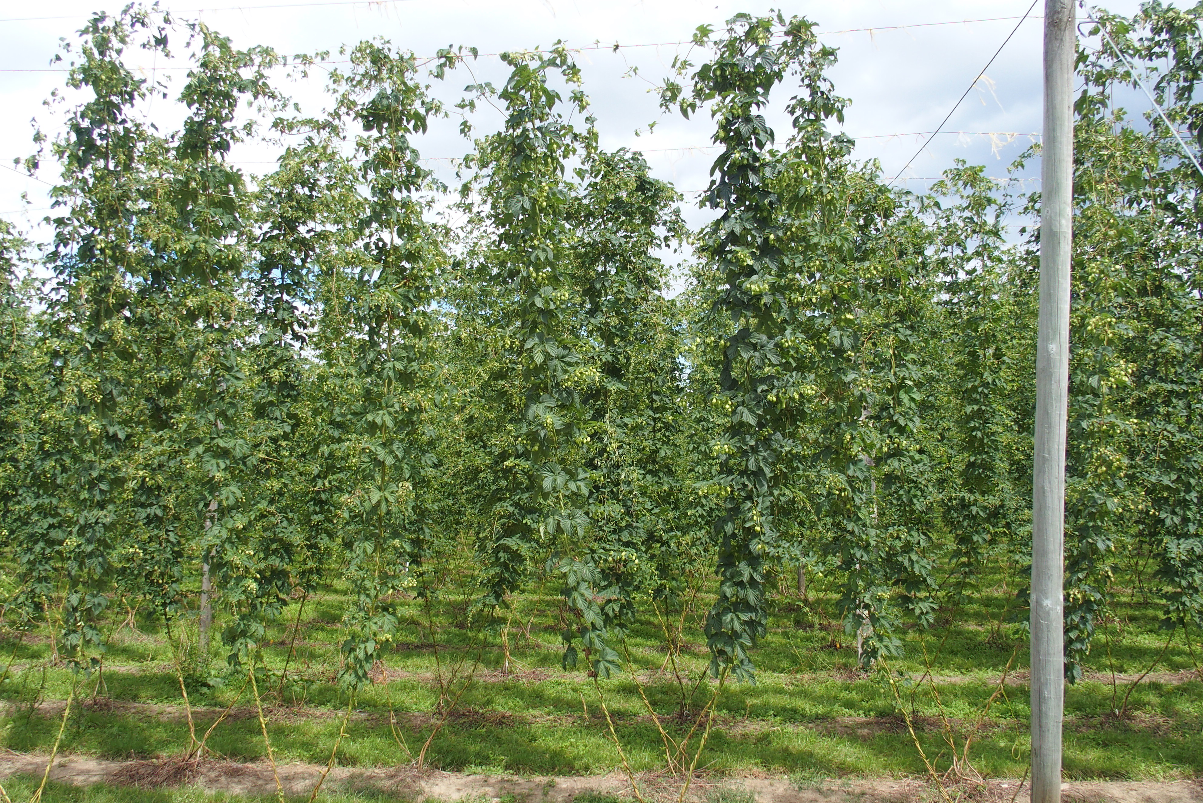 When we arrived in New Zealand in late January, we were in the middle of summer. (It’s the Southern Hemisphere, so everything is upside down, right?) And now we found hops still on the vine, or rather bine, as the growth up the long wire is known.