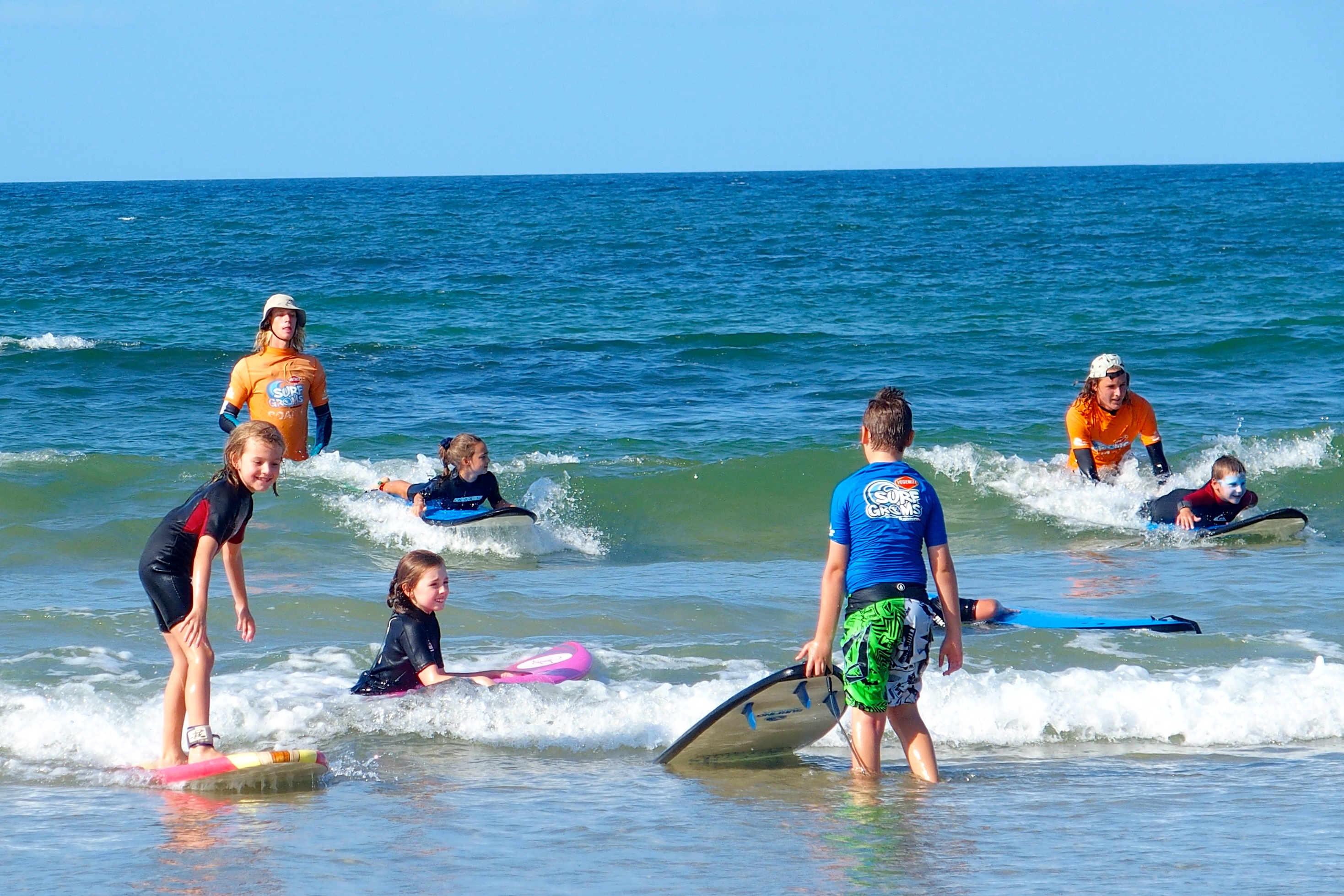 The two adults in orange are pullers and pushers, helping the kids paddle out through the surf and catch a wave back to shore in a foot or so of water.