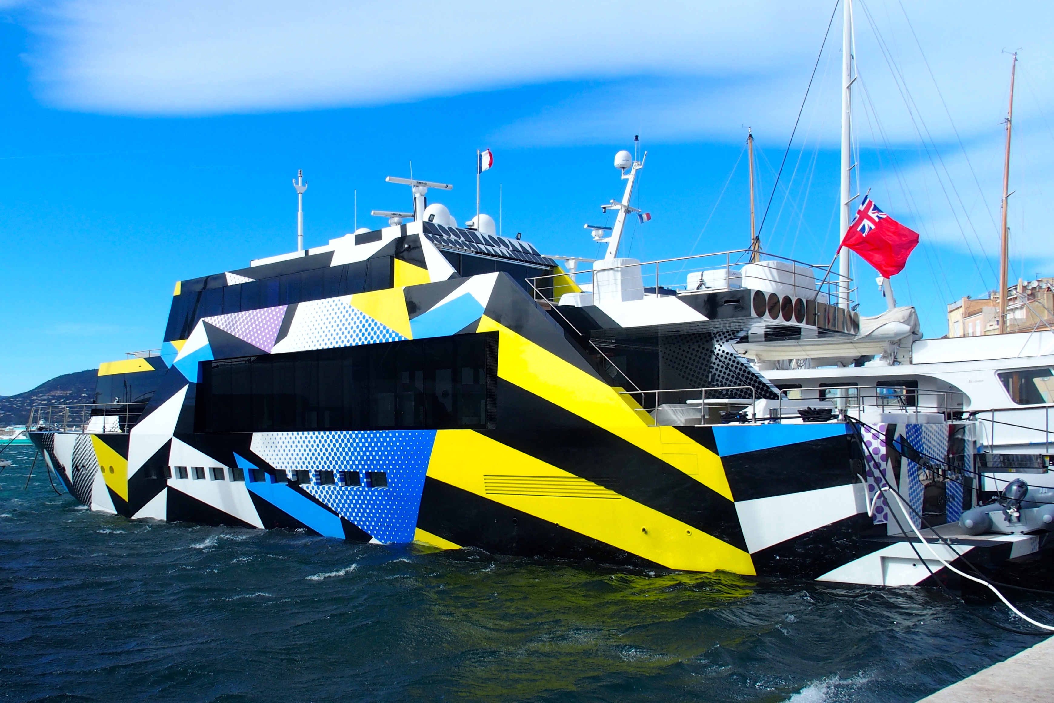 Although tourist season hasn’t officially started, the streets of Saint-Tropez are already crowded with both pedestrians and cars, making it even more difficult to drive in and out of the town. The solution? Use your yacht to avoid the crowds. Dakis Joannou, a Greek billionaire, owns one we saw in the harbor. Guilty is 114 feet long and painted in an outrageous contemporary art pattern inspired by military camouflage…or possibly madness.