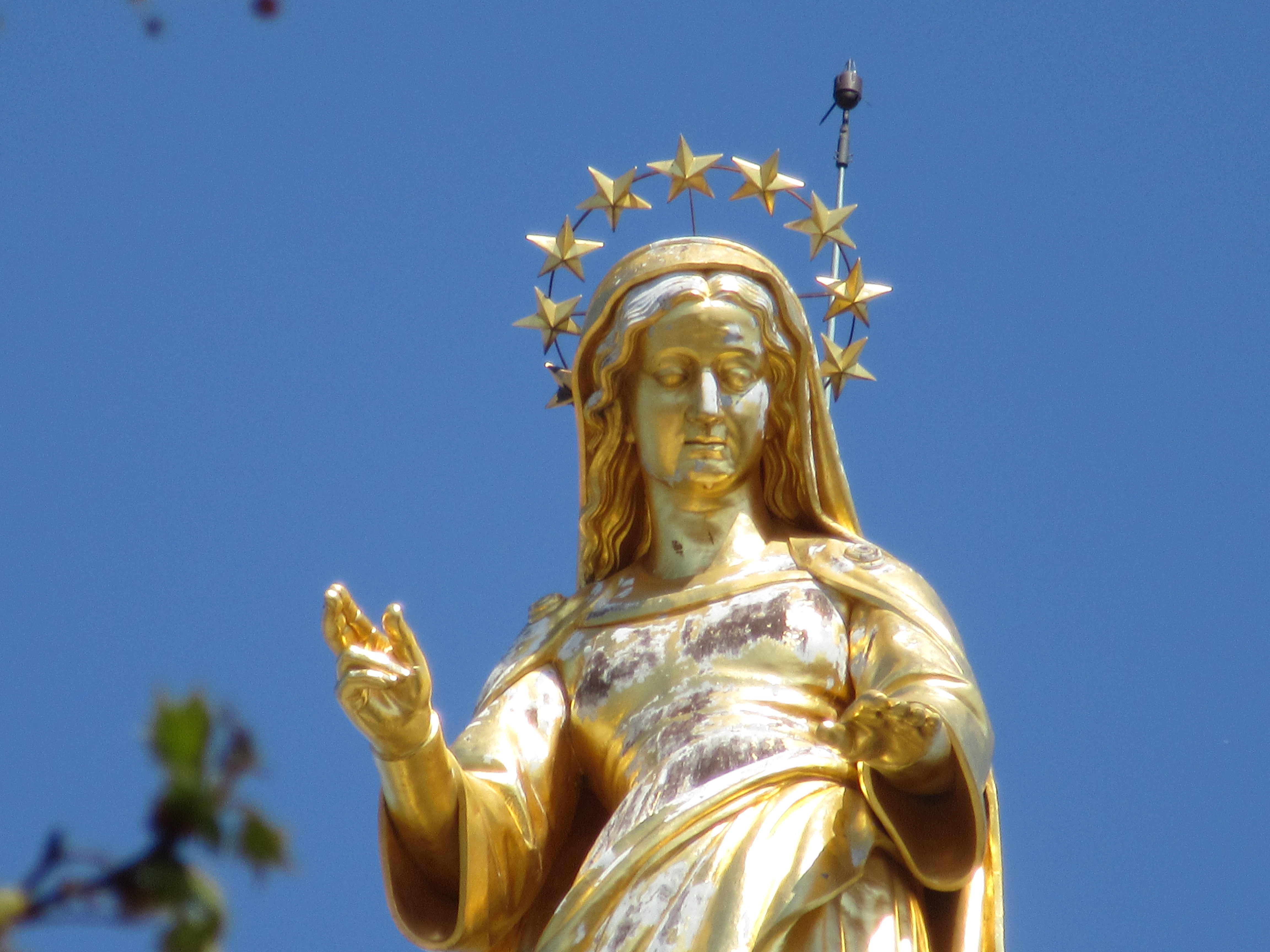 A gilded statue of the Virgin Mary stands atop the bell tower of the cathedral.