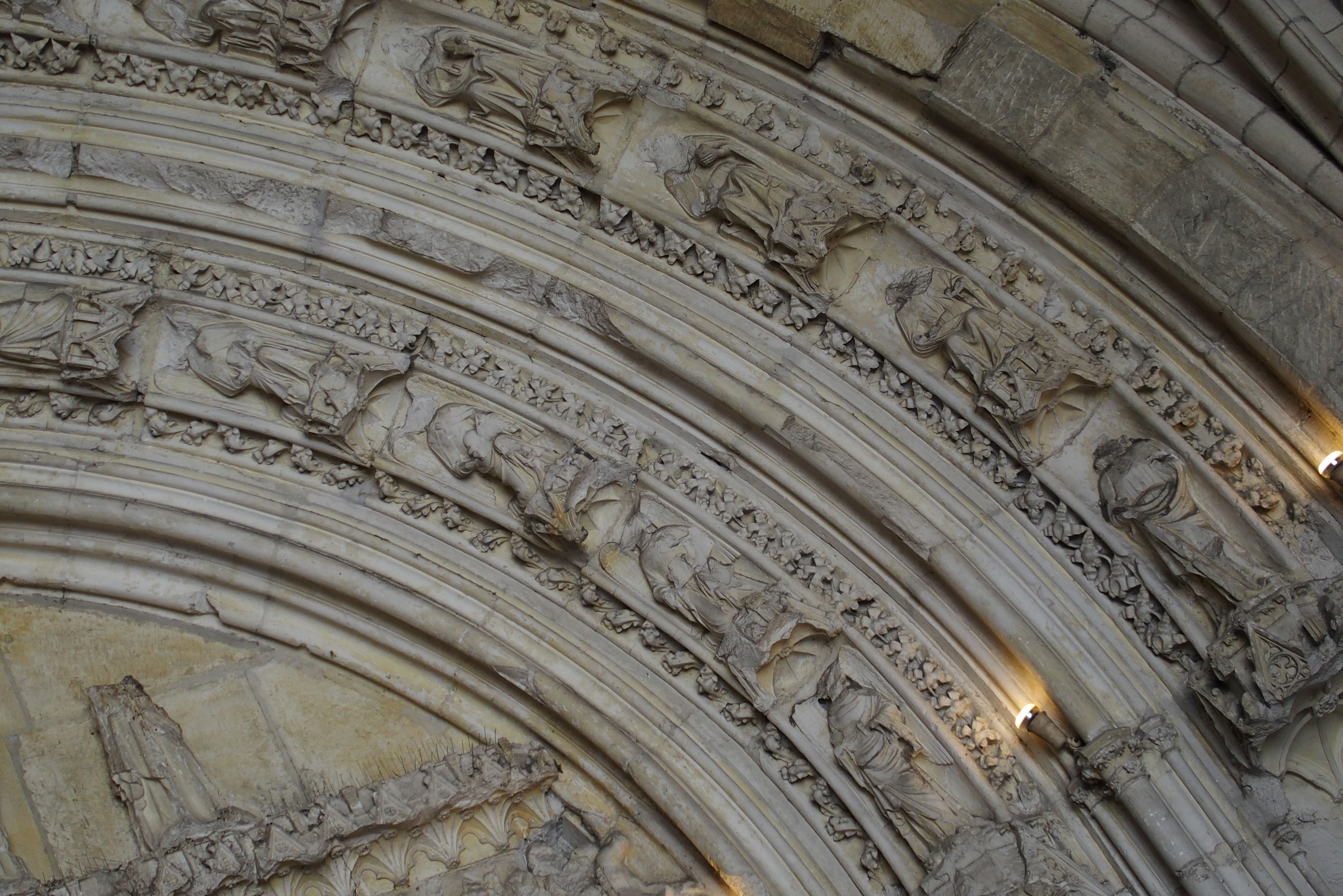 Much of the detail of the stonework remains in the huge arches, but many of the heads were knocked off during the time of the French Revolution.