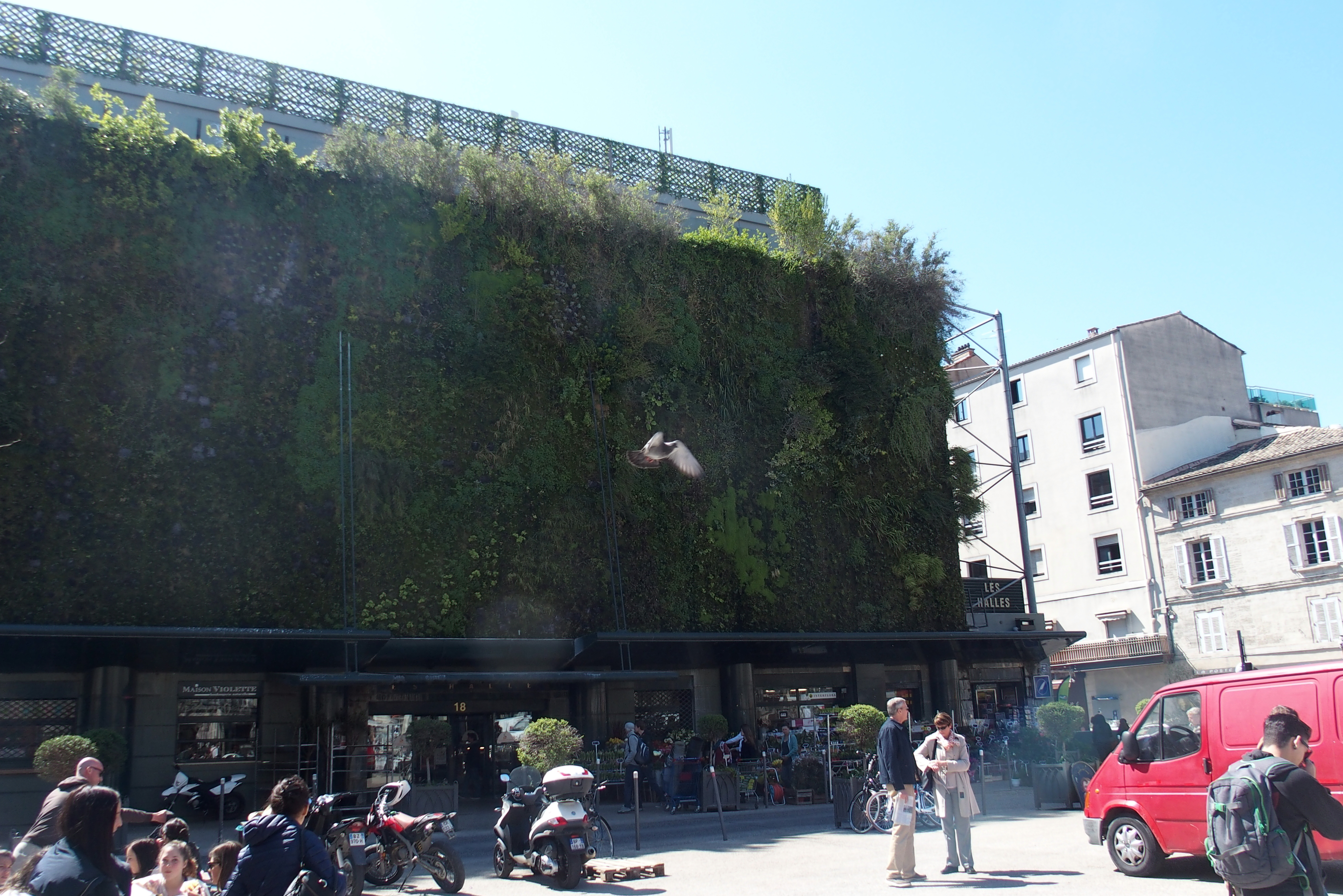 Les Halles, a large shopping market, has an interesting outdoor “living wall” with more than 400 species of plants.