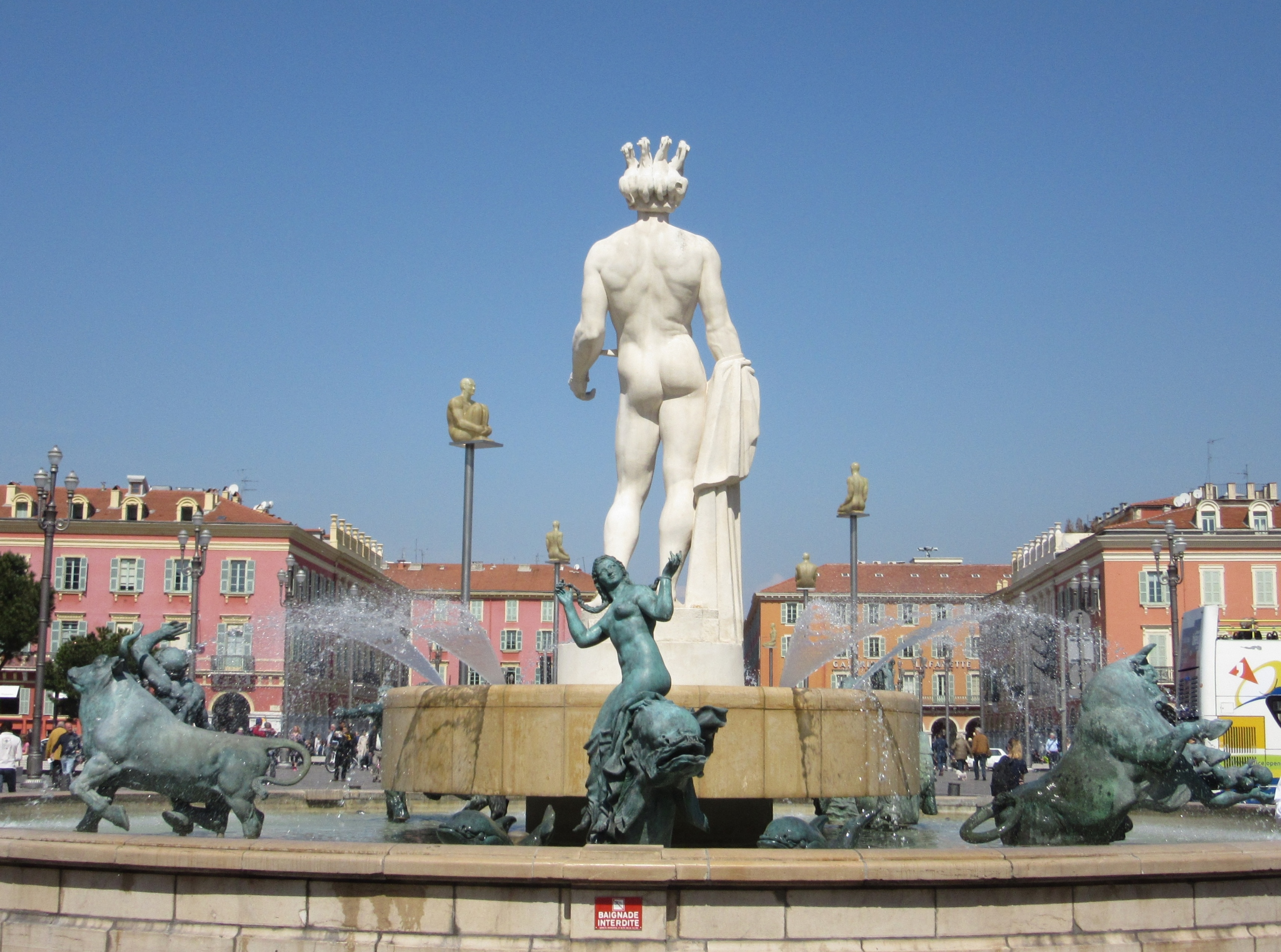 Nice has a large, beautiful pedestrian plaza named Place Massena. It is, however, cut through with an electric train. (They can be quiet and sneak up on you!) The plaza has a beautiful fountain with a statue fittingly known as Fontaine Du Soleil, Fountain of the Sun.
