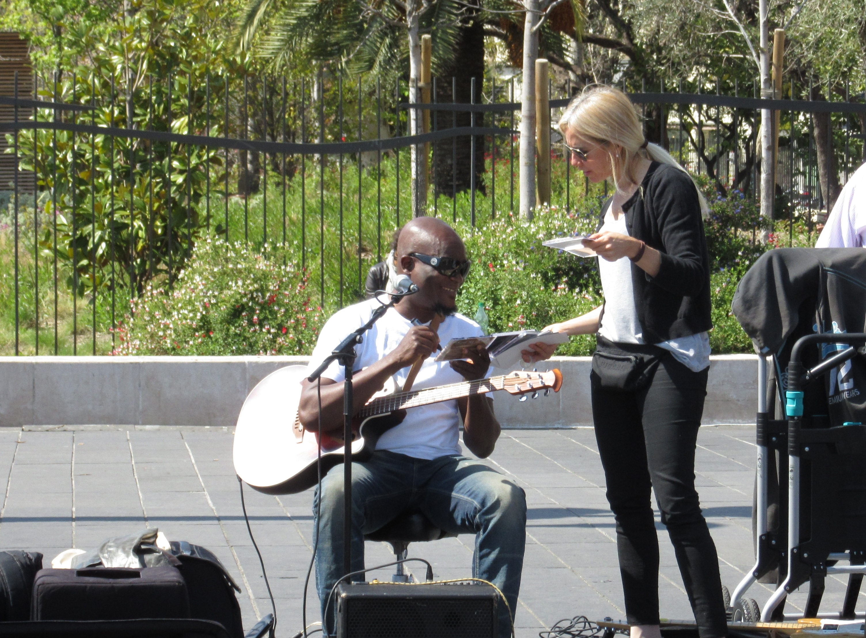 On a lovely spring day we saw fellow tourists, school groups, a bevy of middle-aged women artists sketching, and some buskers. One in particular impressed us: Aaron Lordson. He’s from Togo and sings in English with a rich, deep, beautiful voice, albeit a few unusual pronunciations. We’ve been listening to one of his CDs as we drive around.