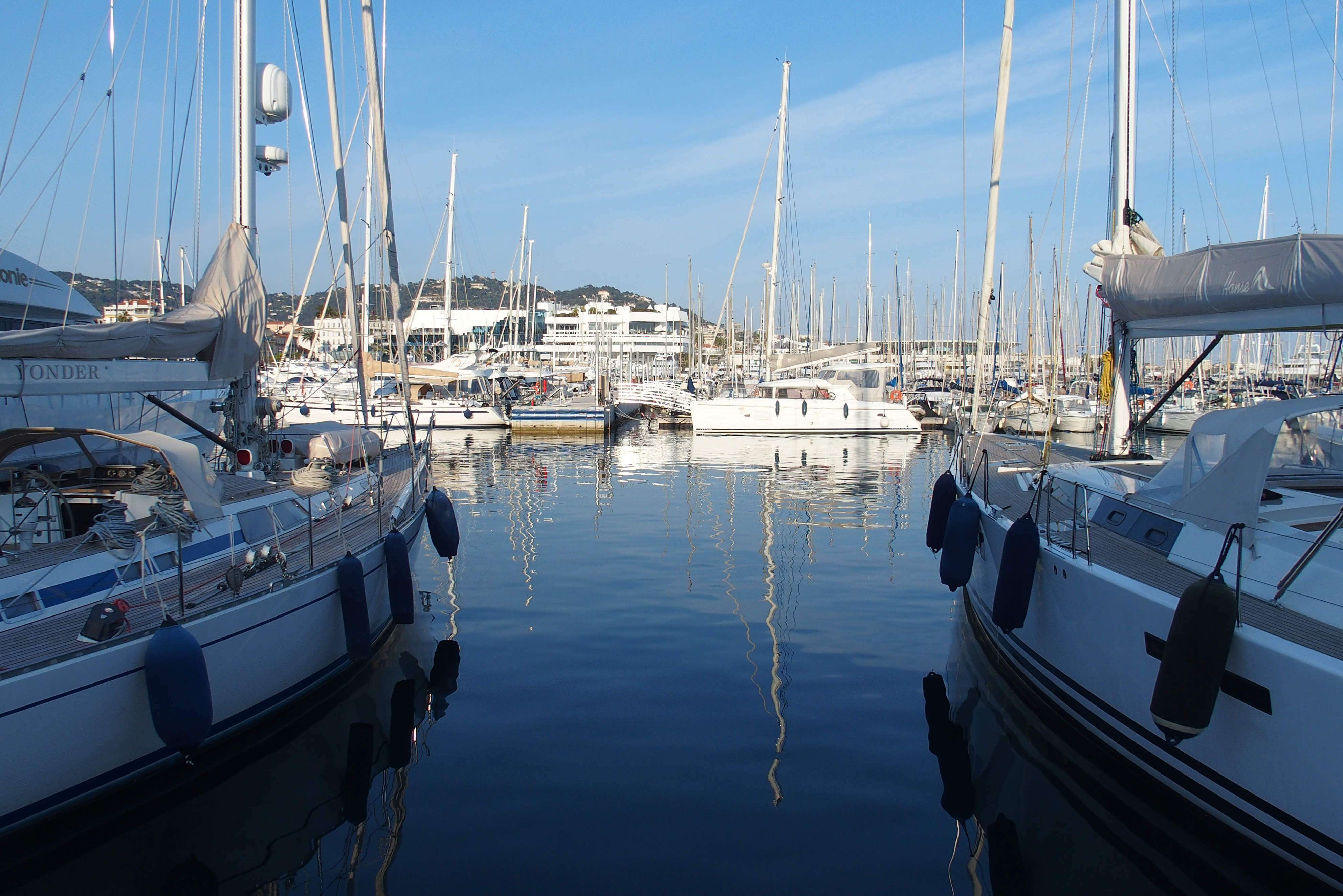 Yachts peacefully floating on the blue waters in the Cannes port. The big ones with celebs have not yet arrived.