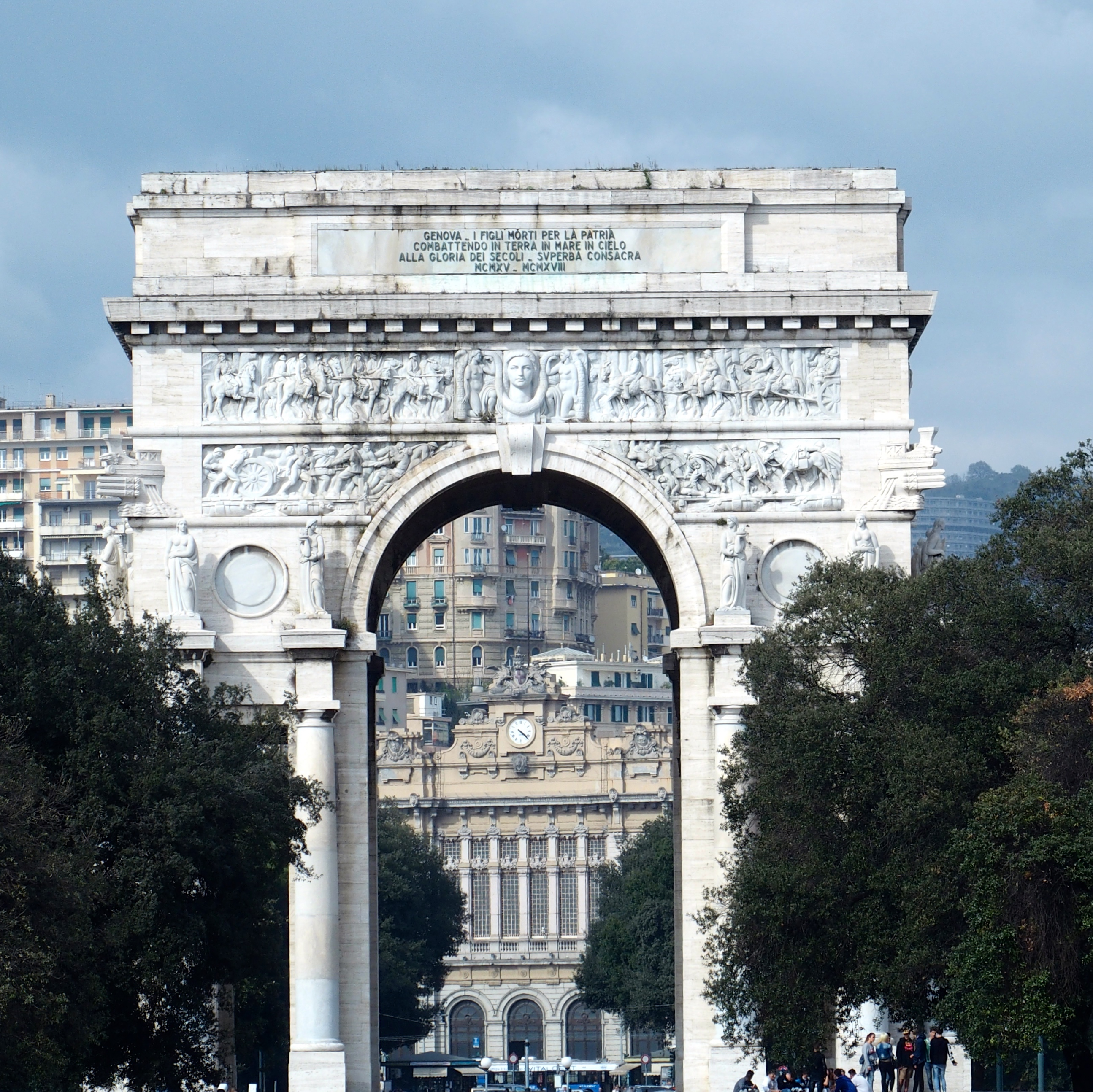 Another major Genovese gathering spot is the Piazza della Vittoria, Victory Square. Here a triumphal arch was erected to honor the patriots of World War I (1915 to 1918 in the inscription).