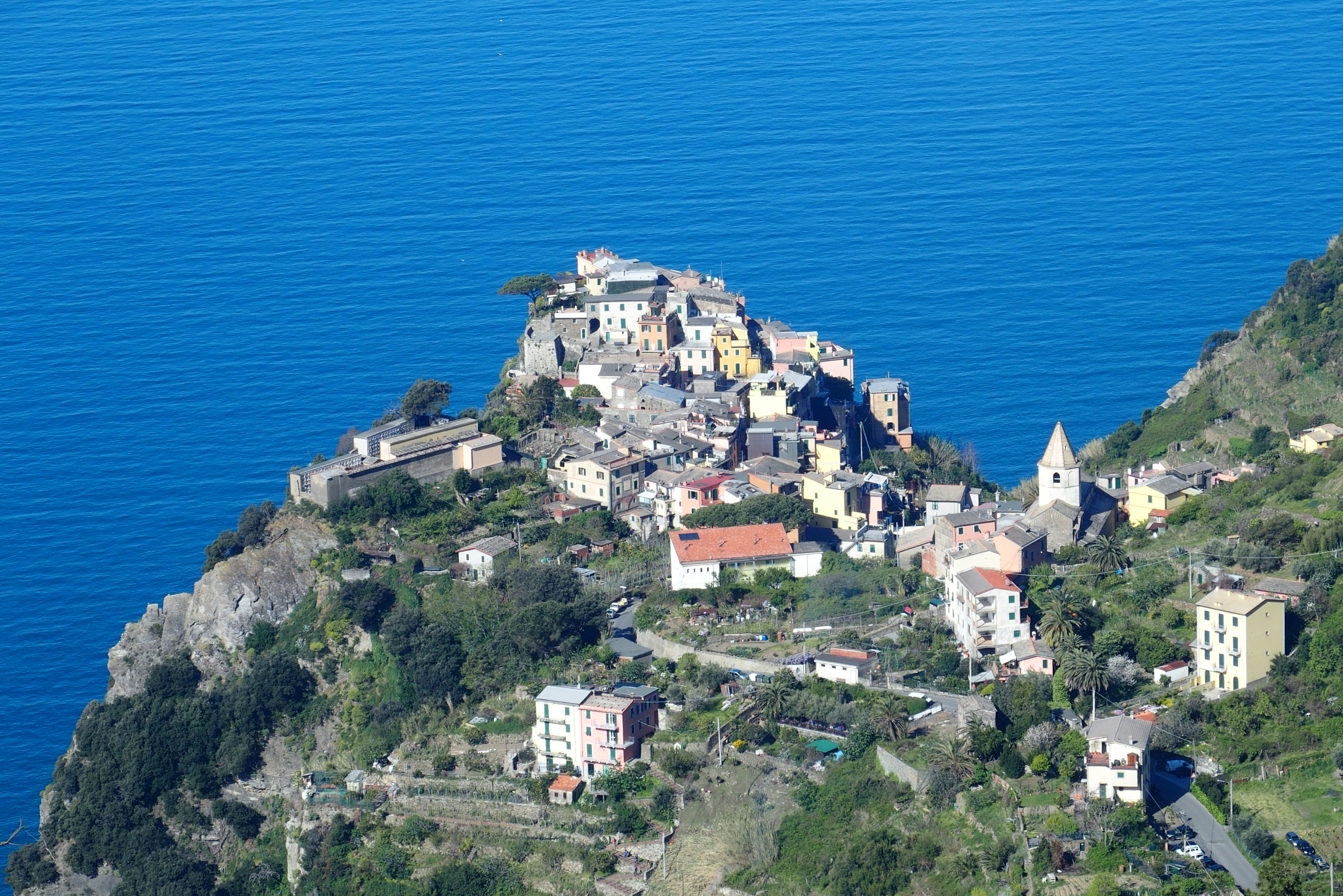 The middle town of Corniglia is perched so high on the cliff that it isn’t even served by the ferry that runs along the coastline of Cinque Terre. Even so, it’s still a long walk down from the hiking trail.