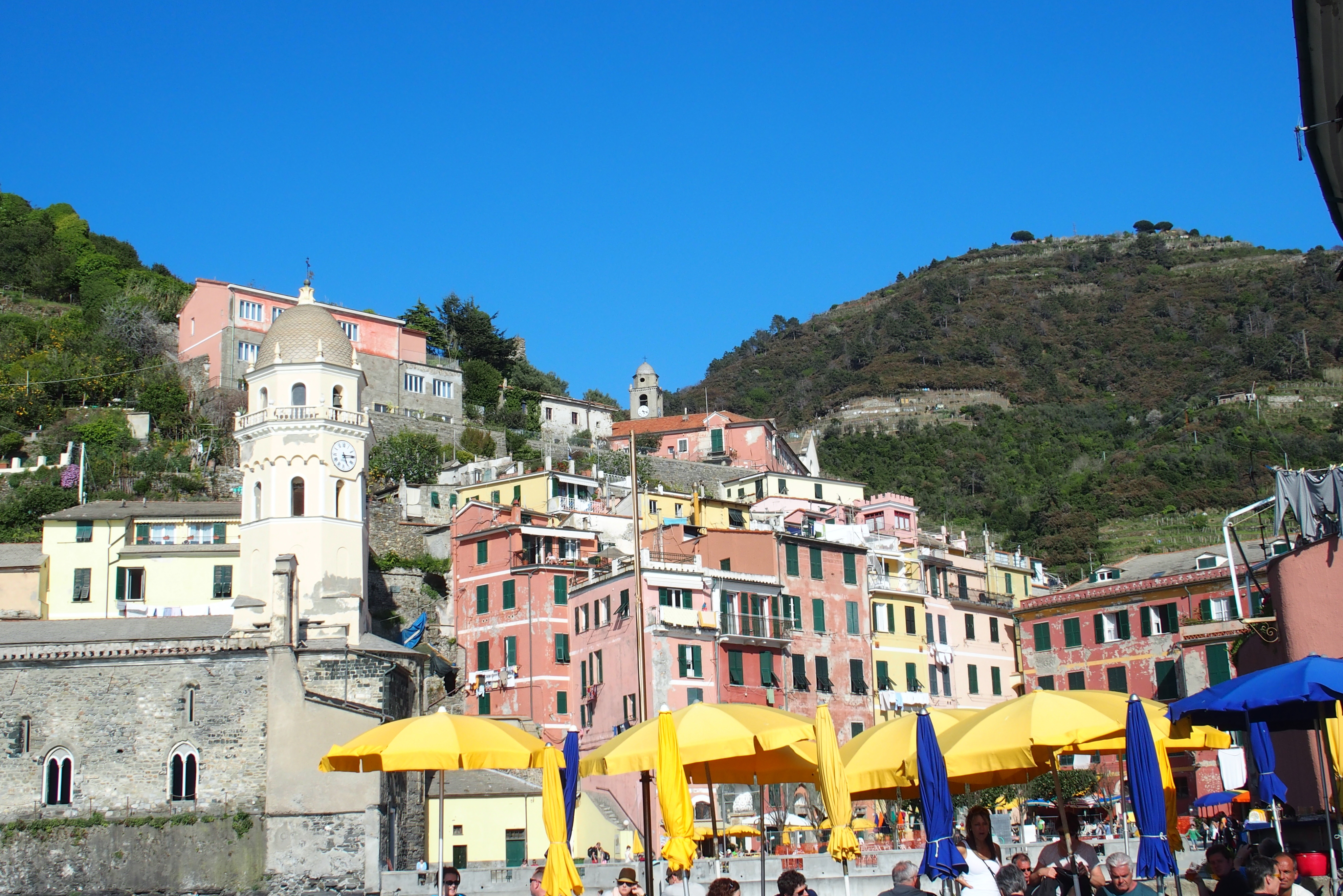 The fourth town of Vernazza is a fishing village that has the largest port of the five towns. The story behind the different colors on the adjacent homes is that fishermen coming to port after a long day at sea want to be able to easily identify which home is theirs so they can see if their wives are busily making dinner…or making “amour” with the baker.