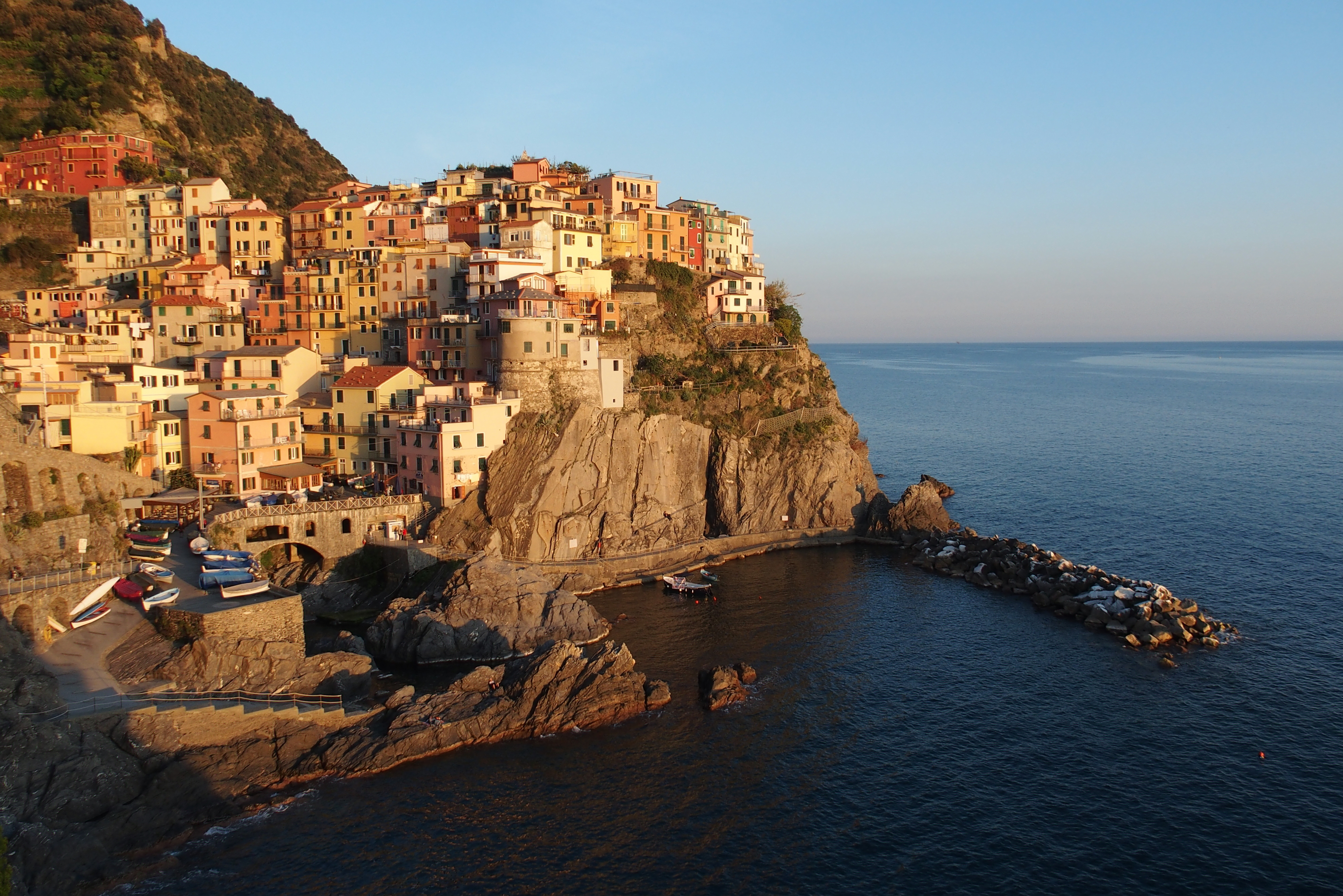 From the port, looking up into the village of Riomaggiore with more pastel homes.