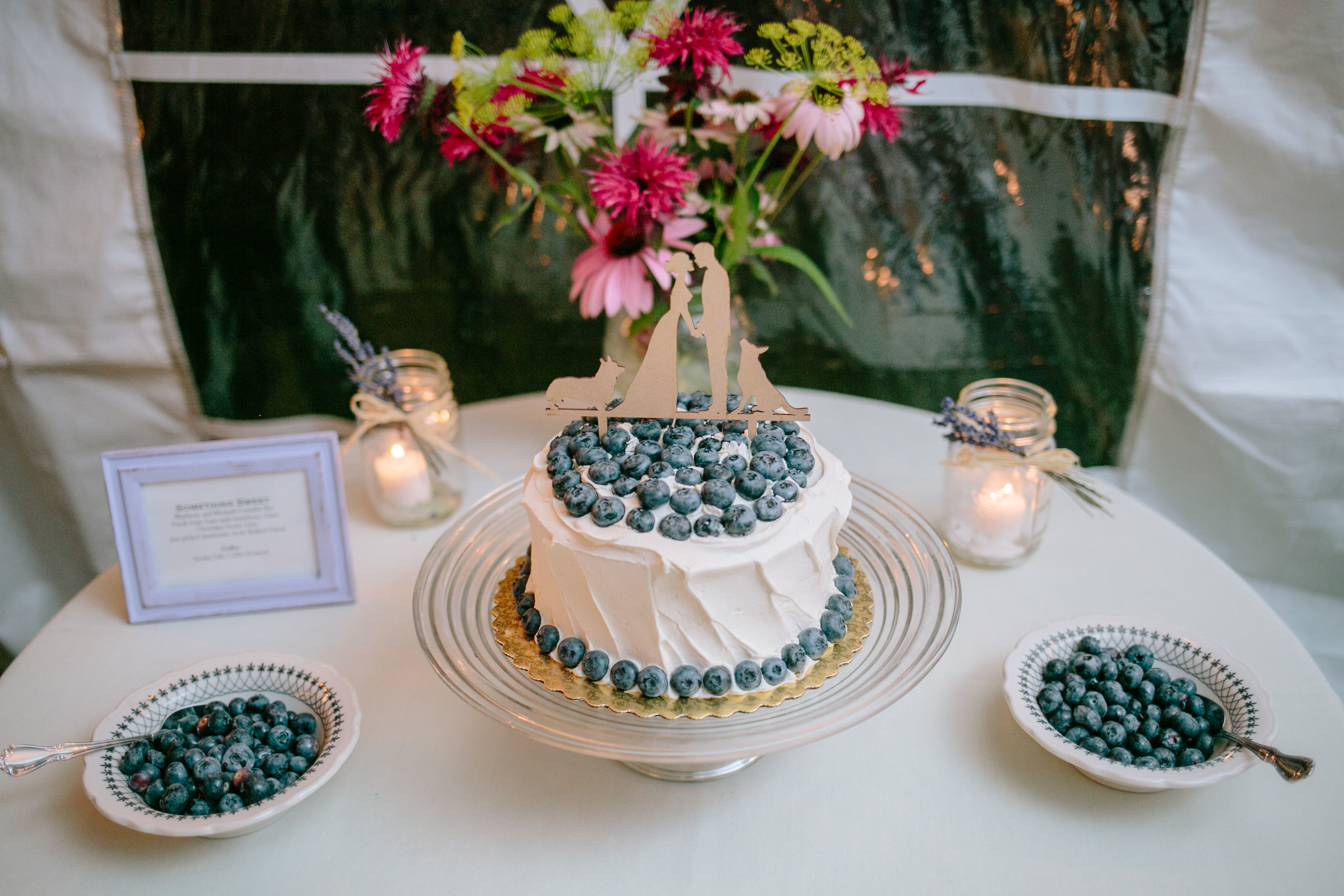Before dawn Saturday the rains came. Our thought: There goes the wedding! Au contraire. By 8AM the sun was shining and the skies were clear. Chris was dispatched to Wegmans for impromptu wedding cakes. Nothing was reserved, which could have been catastrophic, but Wegmans (and Chris!) came through, as always. Philip and Jonathan picked more Bedient berries to garnish the cakes and the ladies of SBBS decorated. (Thanks, Lauren and Sarah.)