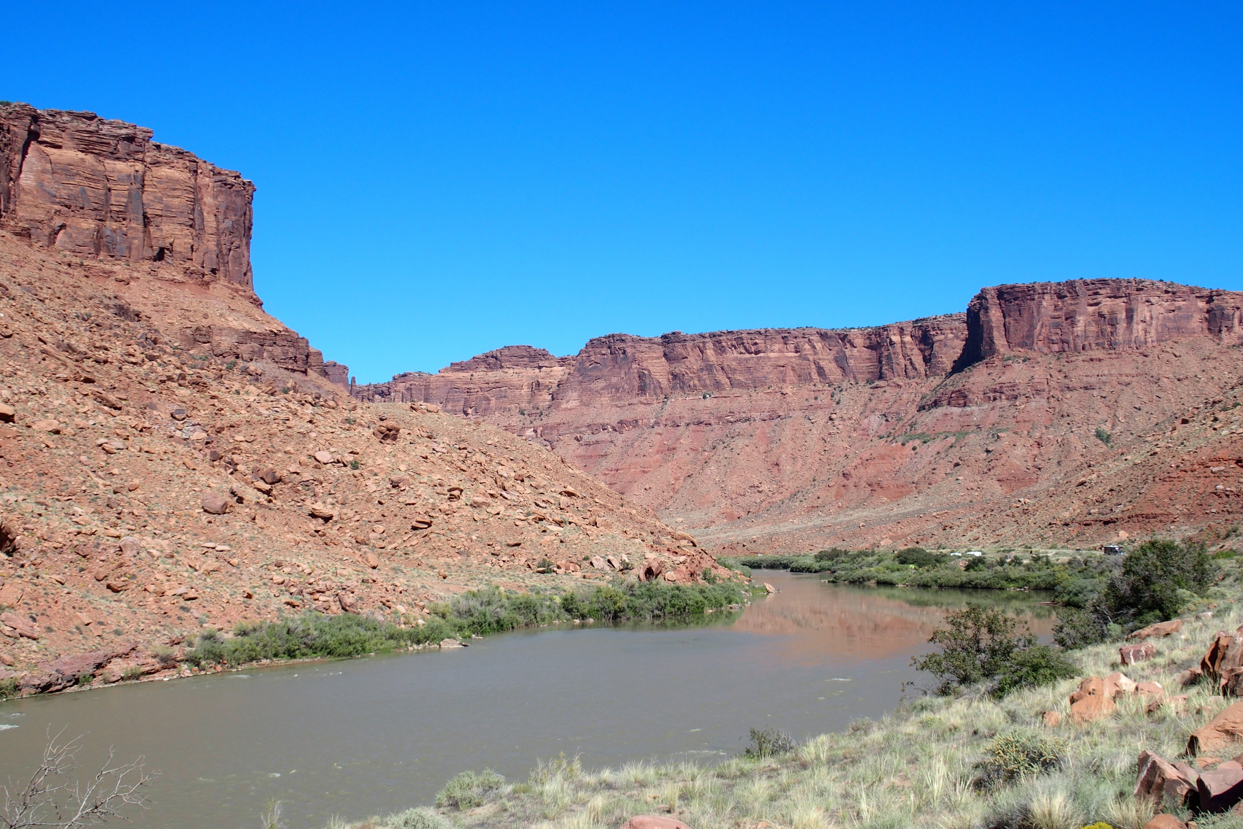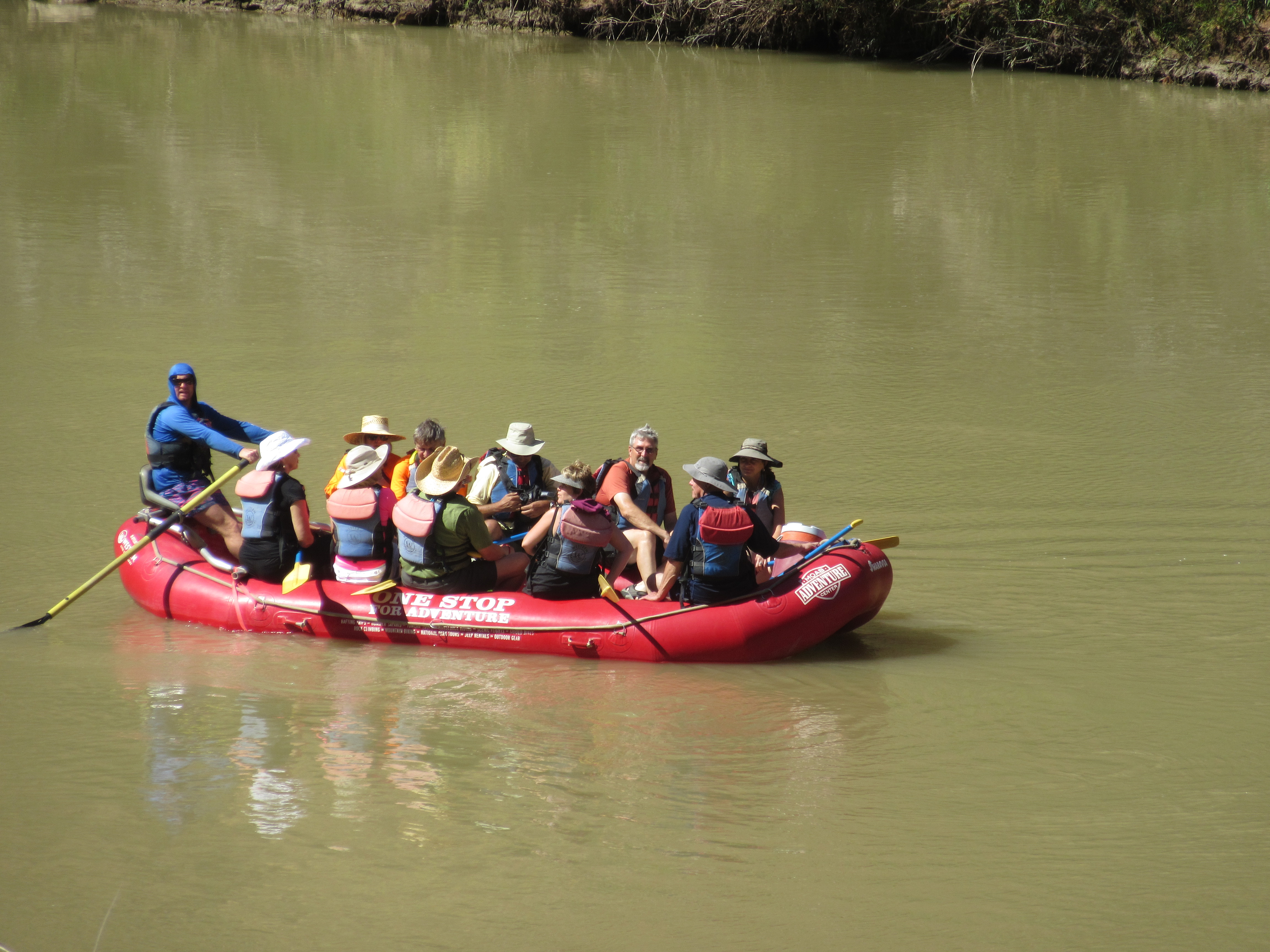 The Colorado flows down through Utah, passing the red, iron-rich sedimentary rocks that were once under an inland lake. Spring snow melt means rapid currents and rough whitewater. Now in September, the waters are fairly mild, but still with some thrilling rapids.