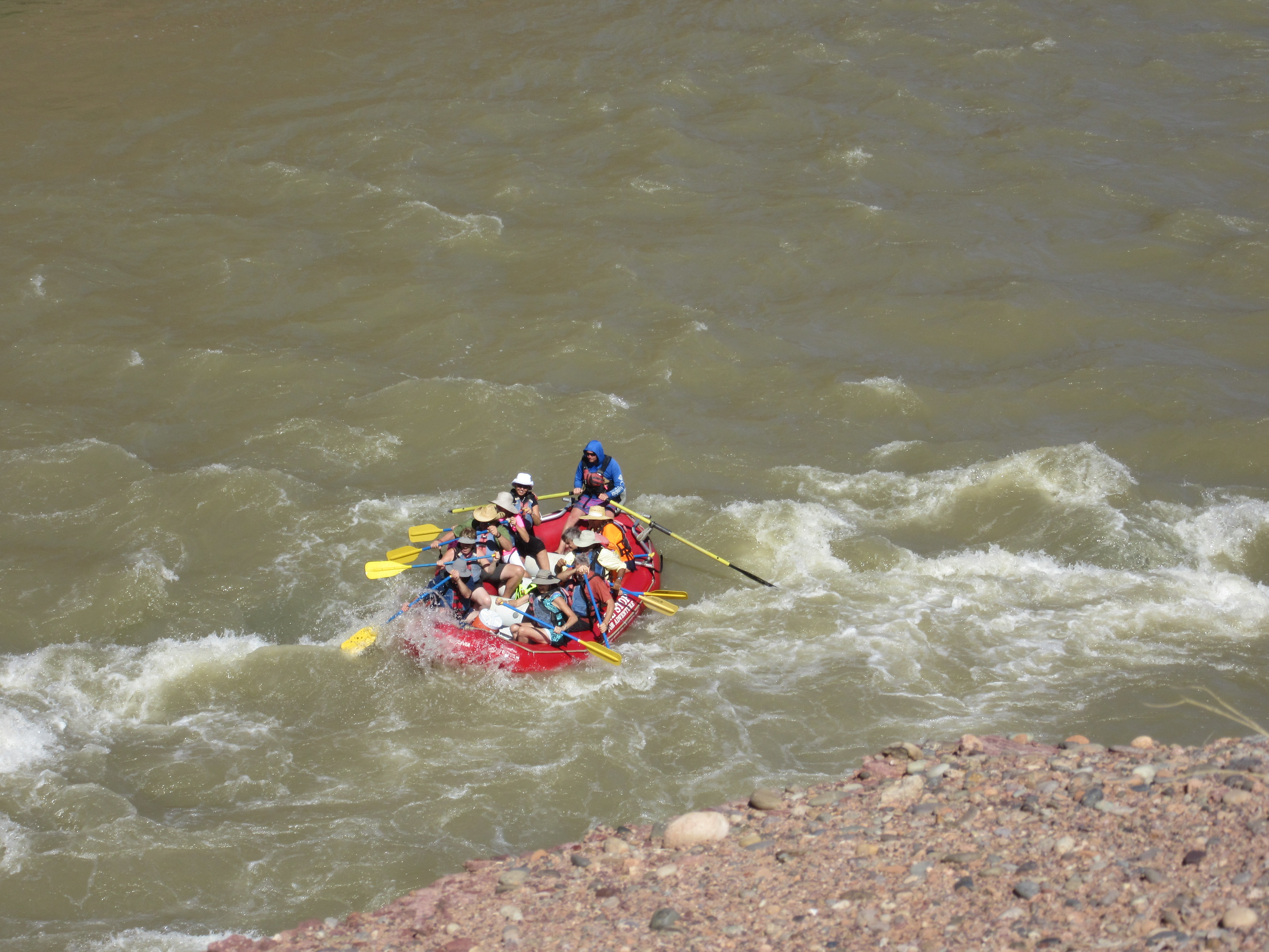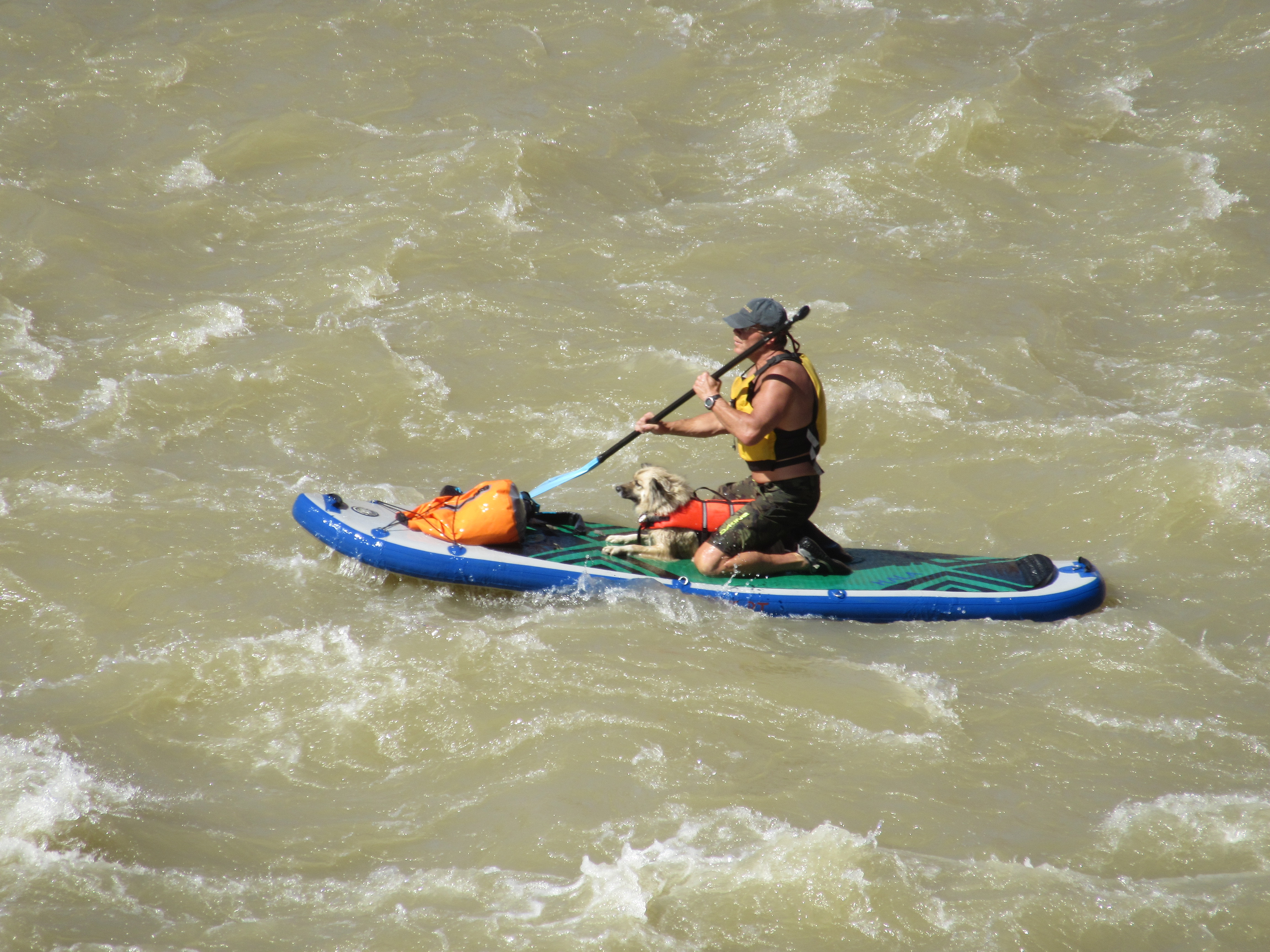 But the Colorado River rapids are a bit more treacherous than the boat chop on Keuka Lake. These experienced paddlers–and their dog–dropped to their knees to get through the rough patches.