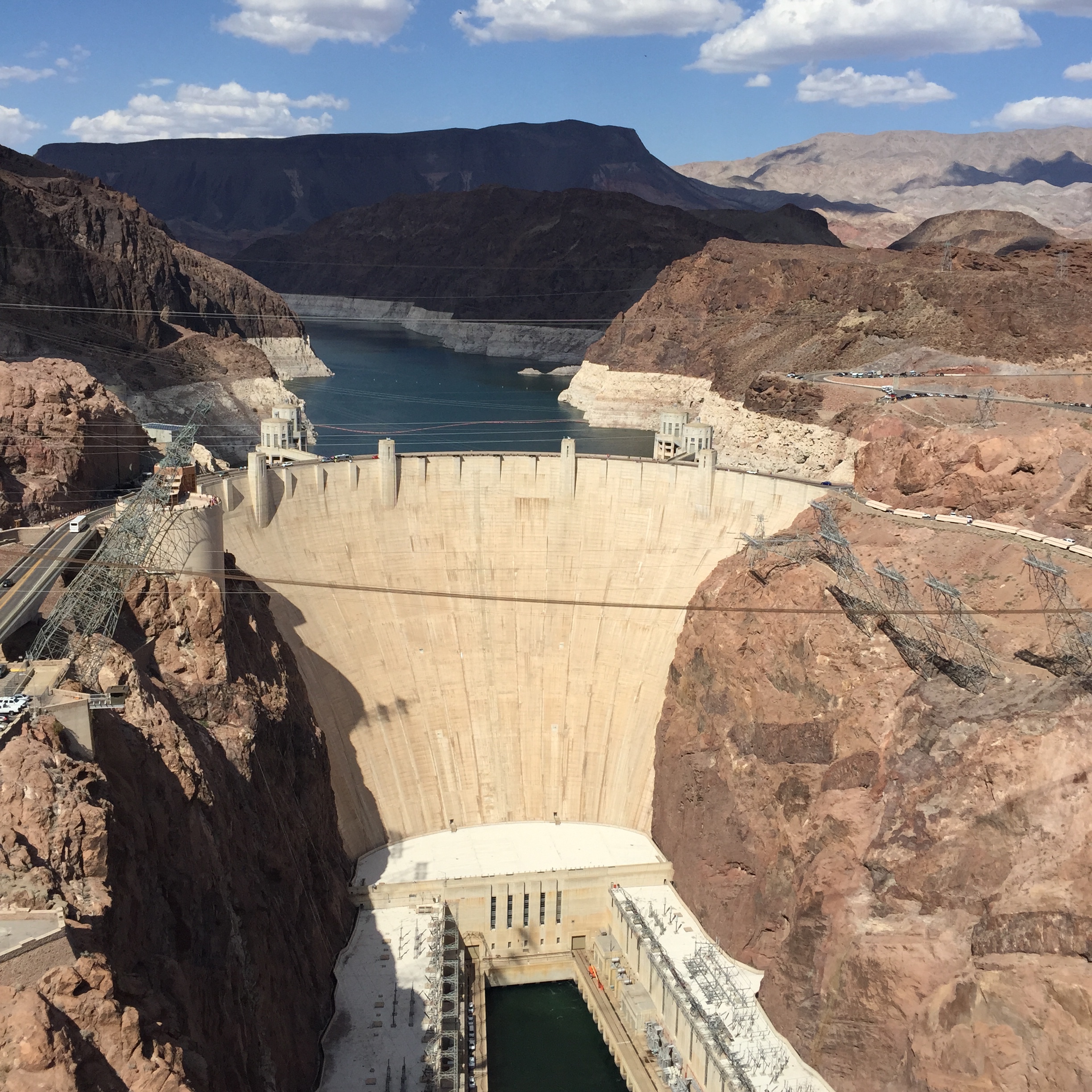 The Hoover Dam, a stimulus work during the Great Depression. Note the old high water marks on Lake Mead behind it.