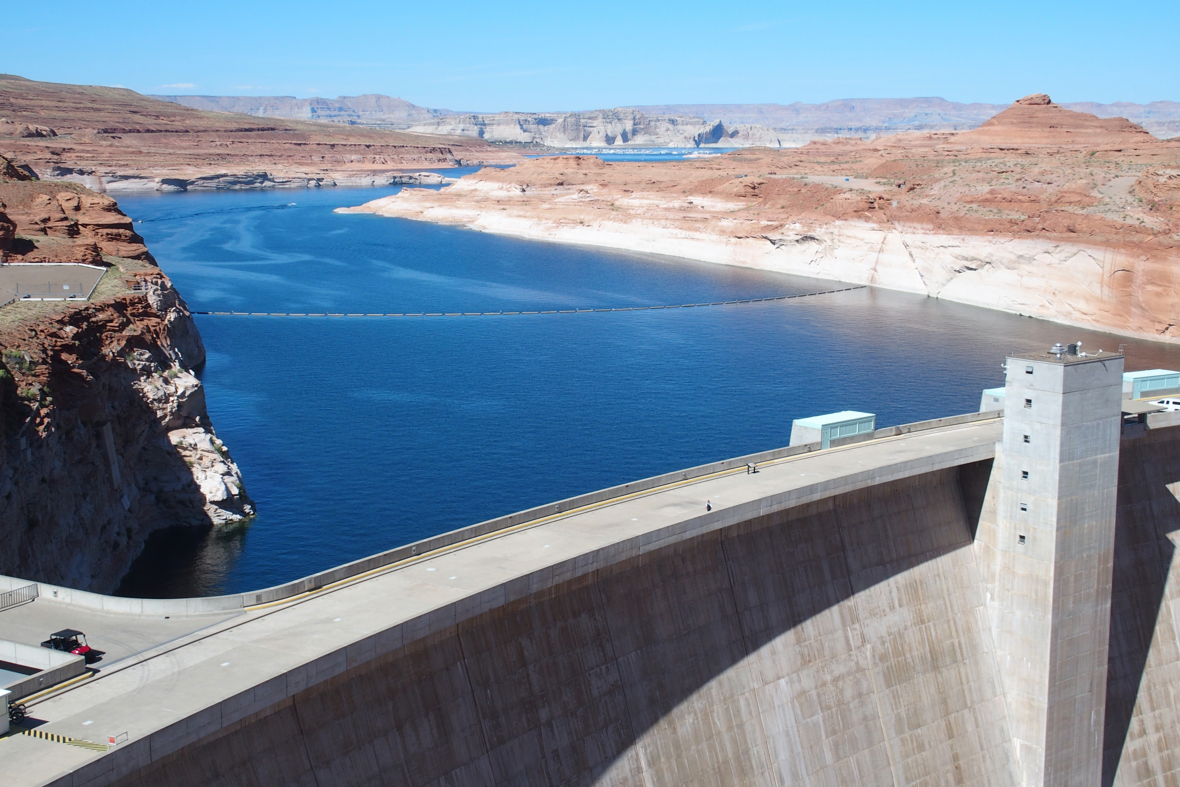 The dam was controversial when built. Fifty years later, the Glen Canyon Institute and many other groups continue to advocate for removing the dam. Just south of the lake, the river once again becomes a shallow flow in a deep canyon.