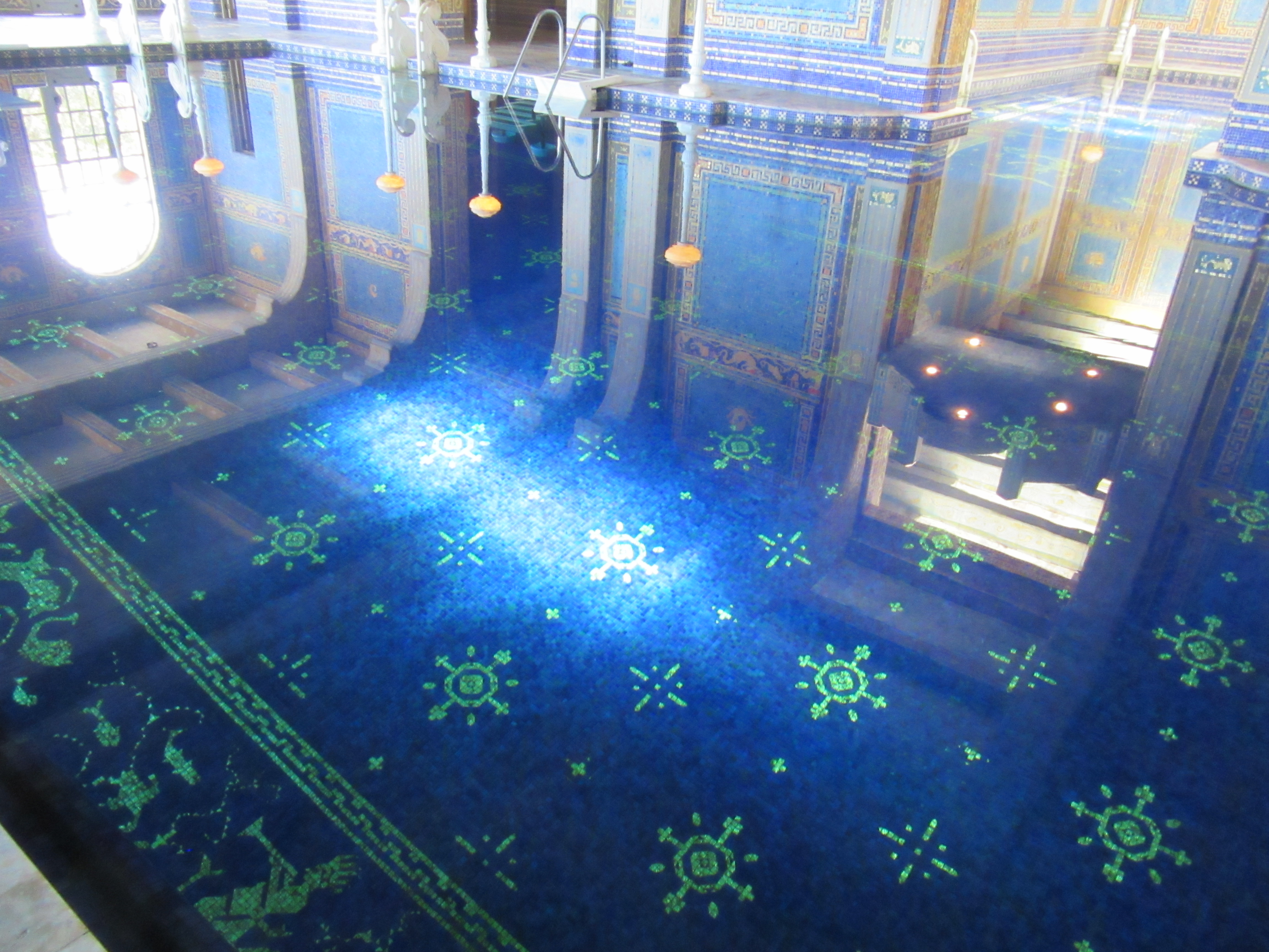 The second pool is an indoor Roman bath. This one features eight Roman and Greek statues and tens of thousands (maybe millions?) of 1″ glass tiles creating colorful mosaics of blue and orange florals and geometrics.