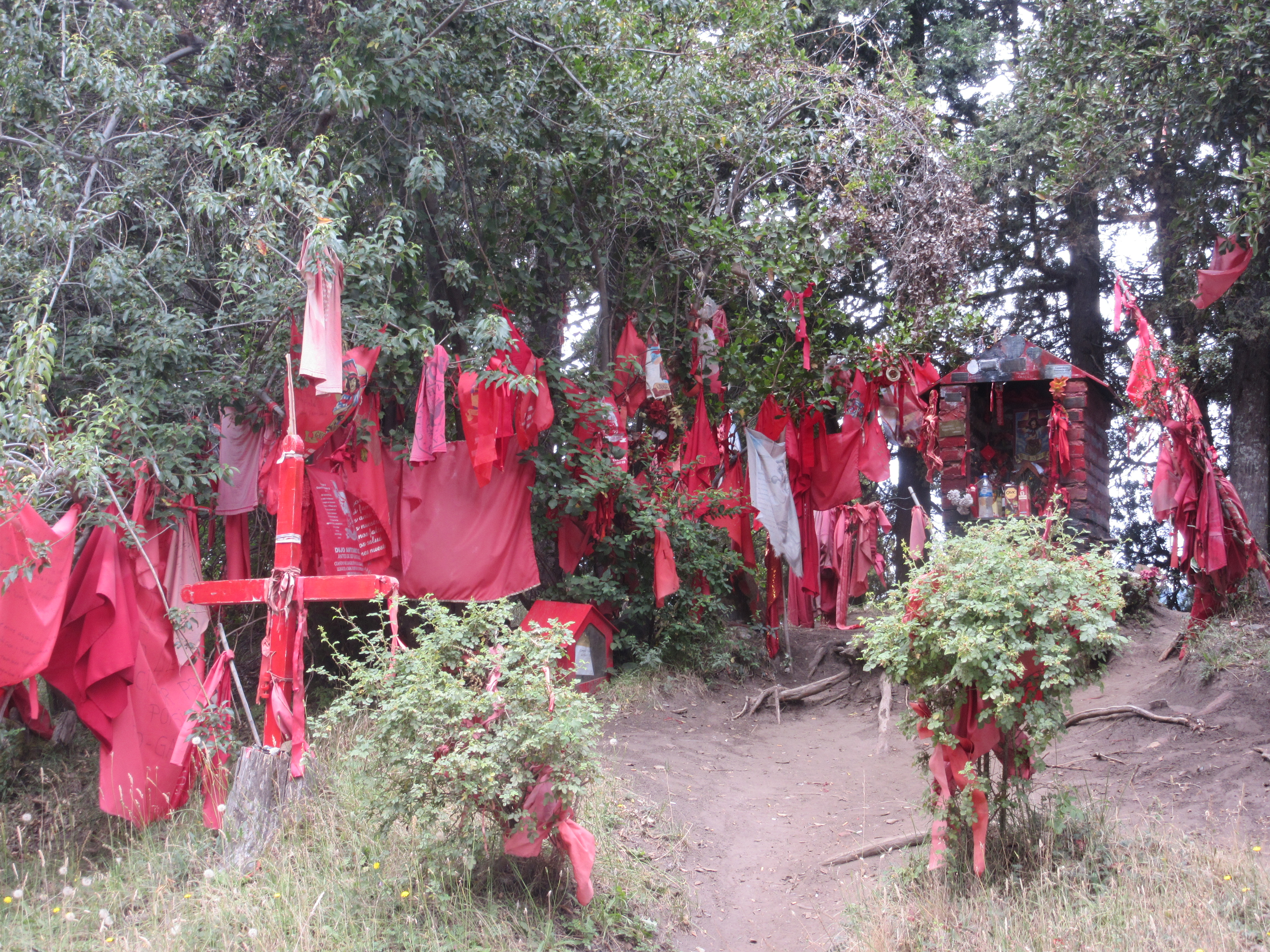 Shrines along the road honor Gauchito Gil, a Robin Hood figure from the 1800s. Folks add bright red clothing and scraps of fabric.