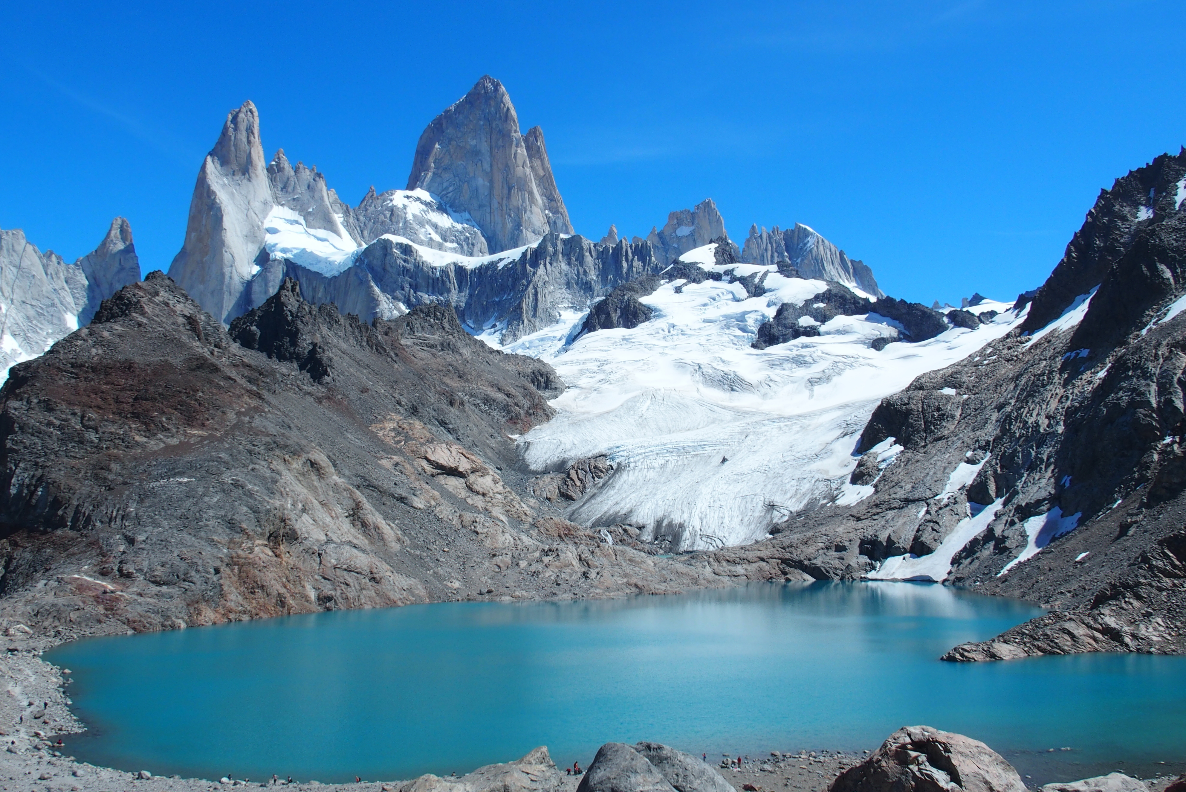 At the top, the view was worth the arduous hike. Although Mount Fitz Roy still looks far away, we were fairly close to a glacier slowly melting to create this blue-green lake high in the mountains. Climbers hike to this level and camp close by to start the actual technical climb early in the day.