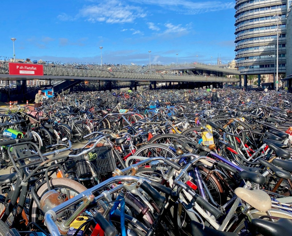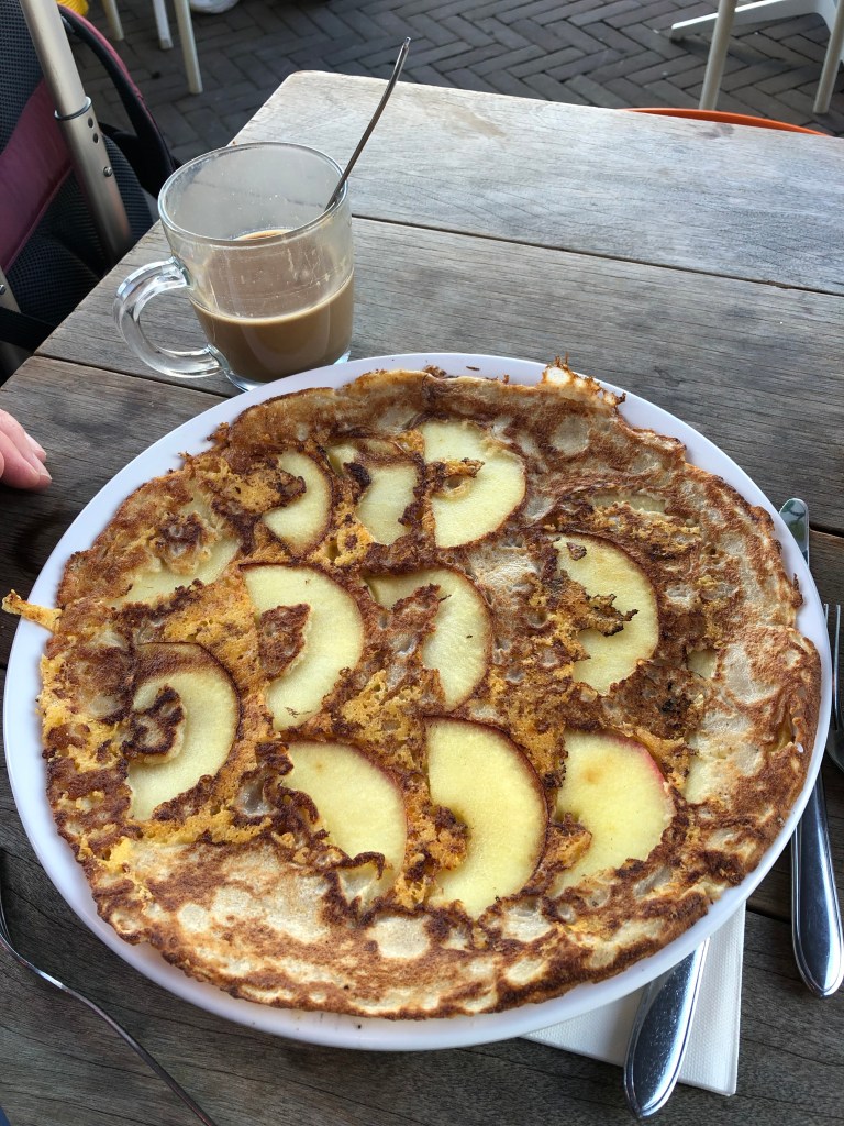 As soon as we got off the plane and train in Amsterdam at 9AM local time, midnight-ish for our bodies, coffee sounded like a great idea. We stopped for a double-caffeine boost and sampled a Dutch pancake. It was really good, a very light crepe, this one with thin-sliced apples and cheese. Other options were not just sweet, but also savory, with ham, pesto, guac, salmon, mushrooms, chili peppers, you name it. We are definitely going to try to recreate on our griddle at home. Maybe we can invent one for the abundant tomatoes and lemons from Kathy’s garden!