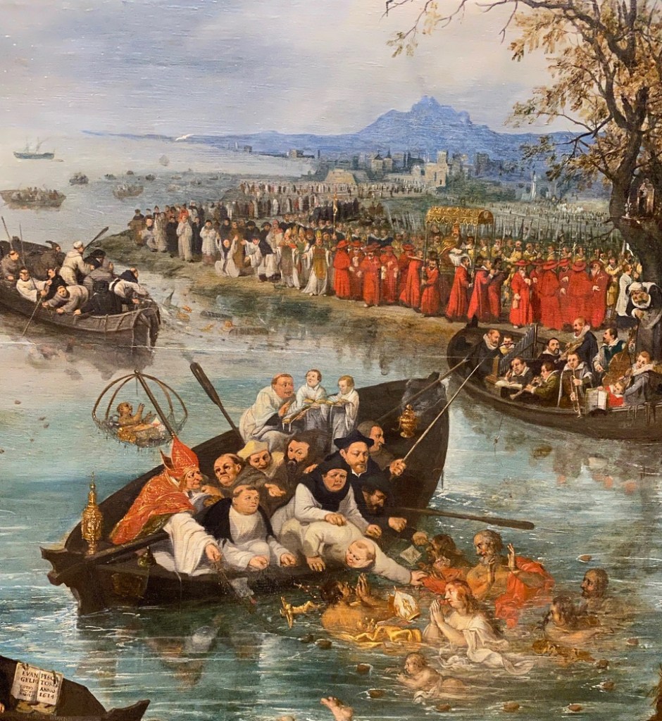 The Netherlands is the home of many of the Dutch masters painters and the Rijksmuseum is the place to go to see their artworks. Among the most famous is Rembrandt’s “Night Watch,” currently undergoing a massive restoration. We were intrigued by “Fishing for Souls,” painted by Adriaen Pietersz van de Venne in 1614, not long after the Catholics got kicked out of town. This interesting painting depicts the conflict between the Protestants and the Catholics. The Protestants, in black on the left, are far more successful in rescuing souls than the less organized Catholics on the right. They seem to know how to keep the boat from sinking, while the Pope-captained boat on the right appears to be floundering. Lots of other artistic allegory going on here such as the brighter light and the trees in leaf on the left (Protestant) side. Even the facial expressions are more clear. We could have used Paul’s help to understand many of the artworks in this museum.